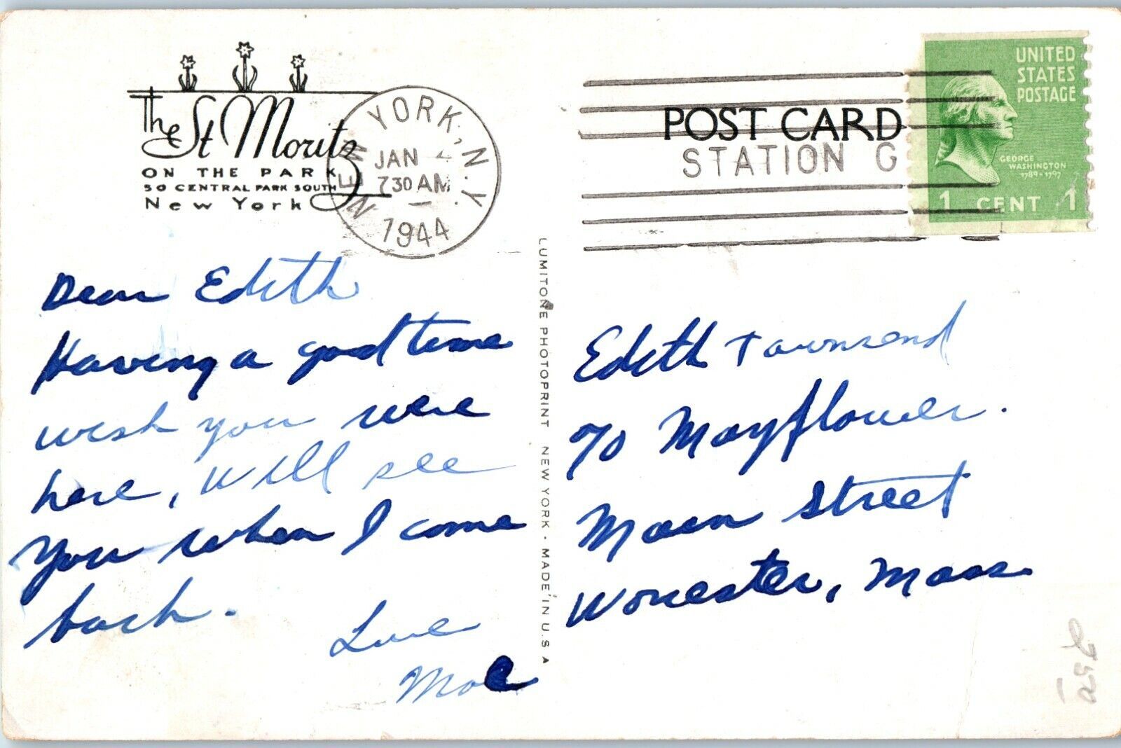 The St. Moritz on the park New York Postcard 1944
