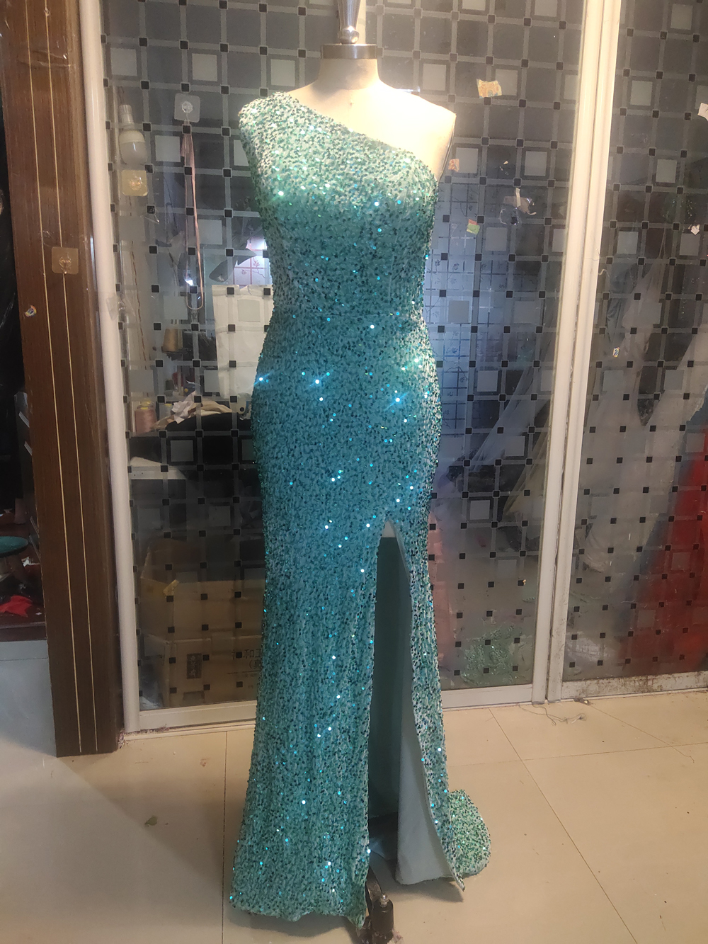 One shoulder Open Back lace up Sequin Velour Lace Evening Dresses woman