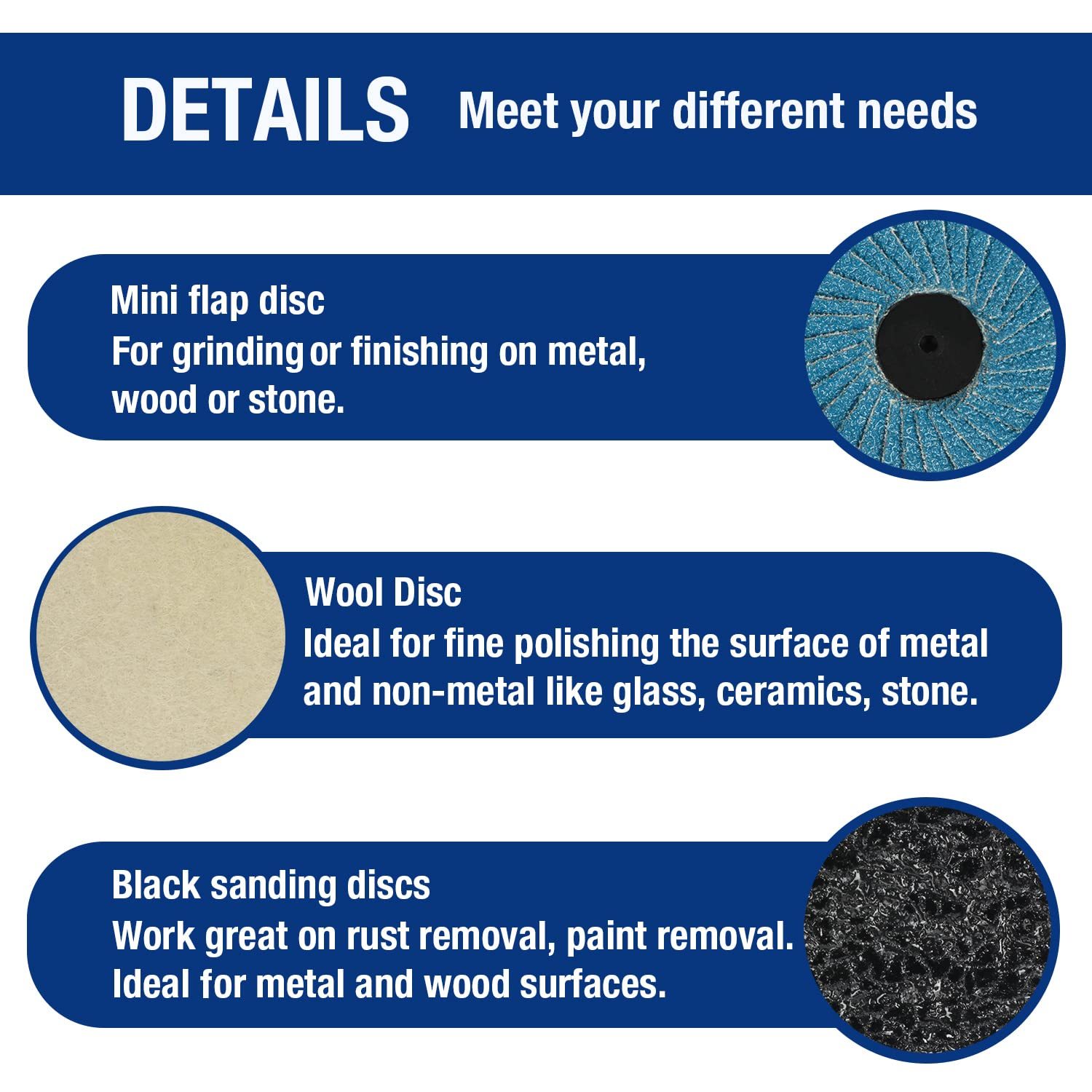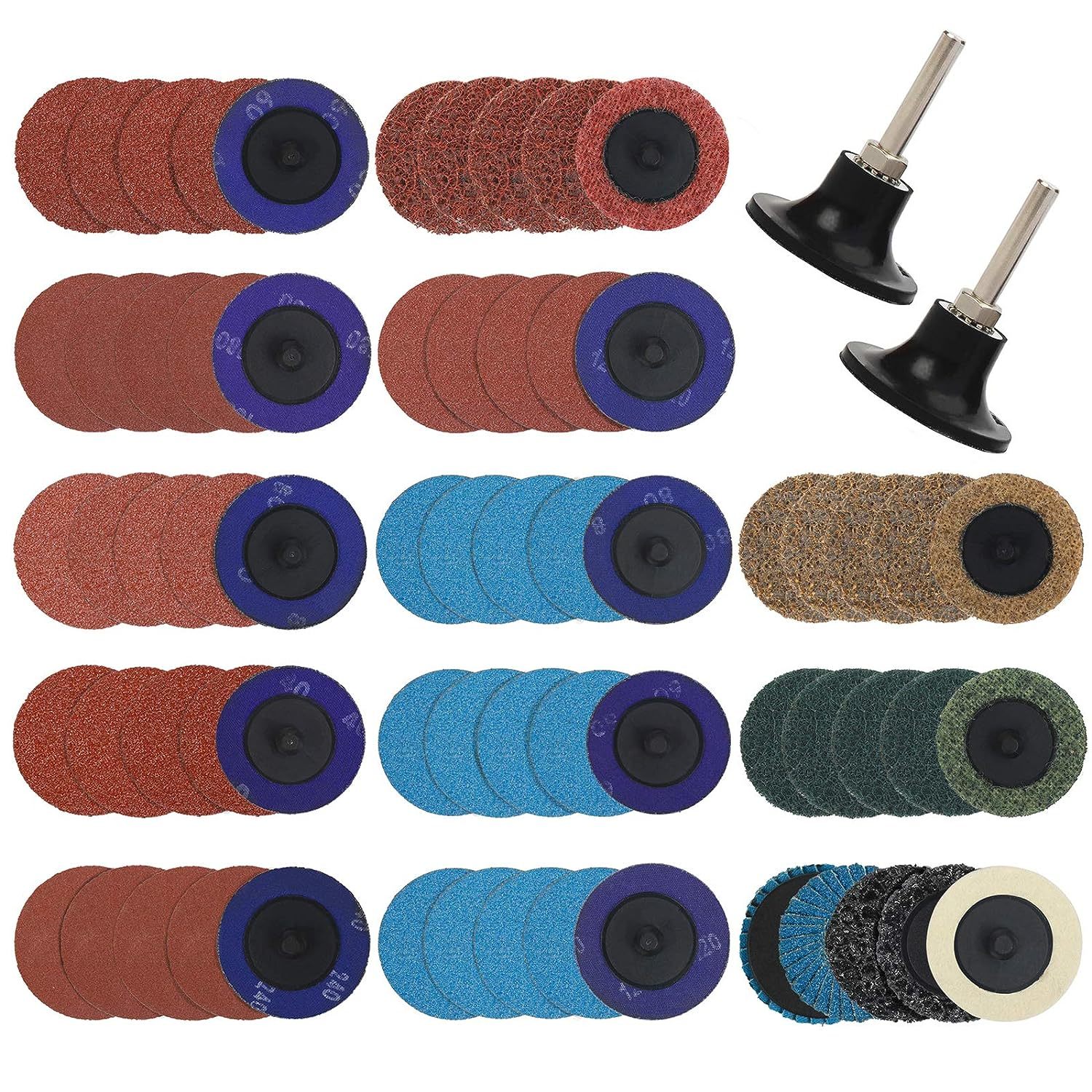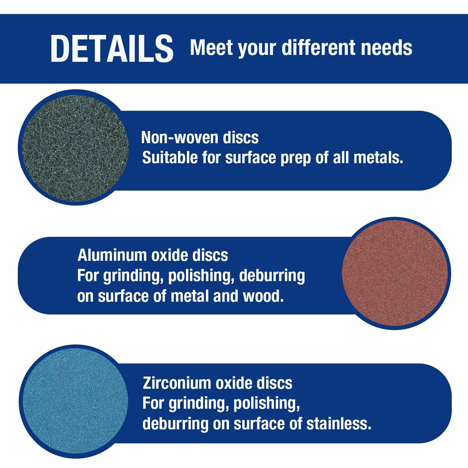 ?Value Kit?The 2 inch discs set comes with two 1/4'' holders, 15 non-woven discs (coarse/medium/fine), 64 aluminum oxide discs (40#/60#/80#/120#/180#/240#), 15 zirconium oxide discs (60#/80#/120#), two mini flap disc (40#), two black sanding discs and one wool disc. The product quantity and grits are indicated on separated packing bags. ?High Performance?These sanding discs combine premium quality sanding grains(aluminum oxide/zirconium oxide/non-woven aluminum oxide/SiC/wool) with strong, high toughness shank base, long last with high abrasive resistance. They can operate up to 23000 RPM. ?Wide Applications?Various surface conditioning discs are excellent for using on surfaces of carbon steel, stainless steel, alloys, iron, non-ferrous and other nonmetal materials like wood, glass, ceramics, stone. Wide used in shipbuilding, car building, aviation, and machinery. ?Easy to Install?These discs have unique safety torque screw, the connection between sanding disc and rubber holder get firm when rotating, ensuring steady working and no fall out. Just twist it to remove or connect, convenient and efficient. ?High compatibility?There are two 2-inch rubber backing pads in the set, which can be attached to any 1/4 inch power drill, air grinding tool, or die grinder. Great for most surface prep works like strip, burr removal, grind, polish, inverted circle and mirror and so on.
