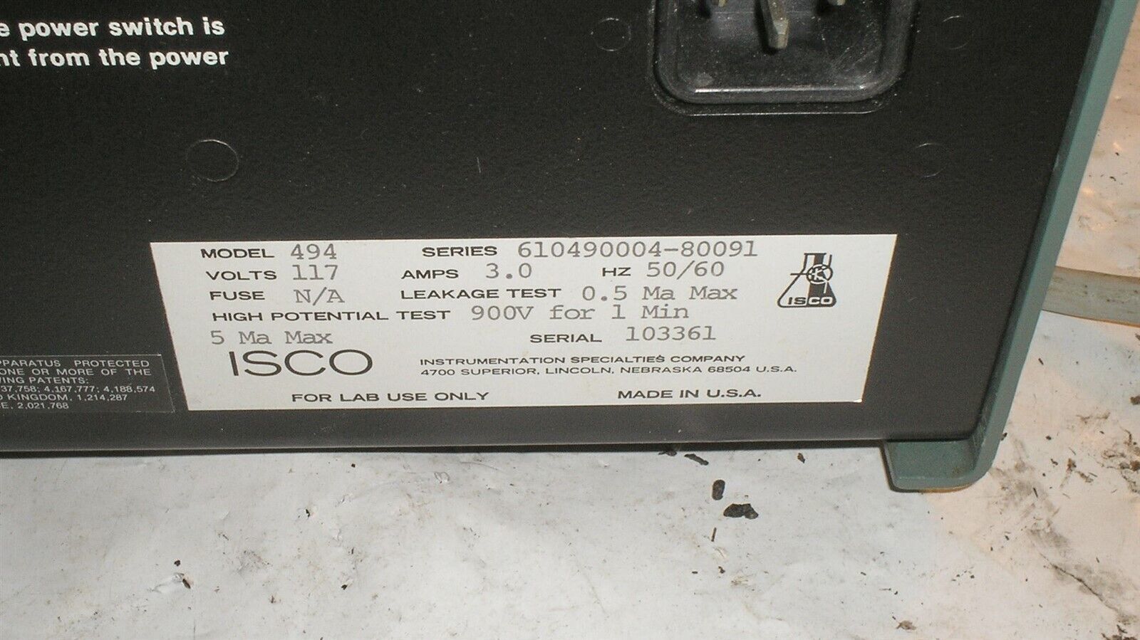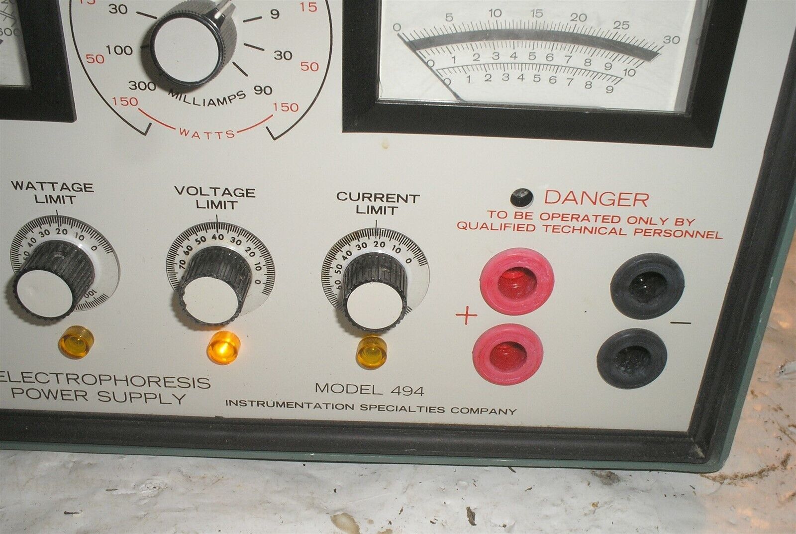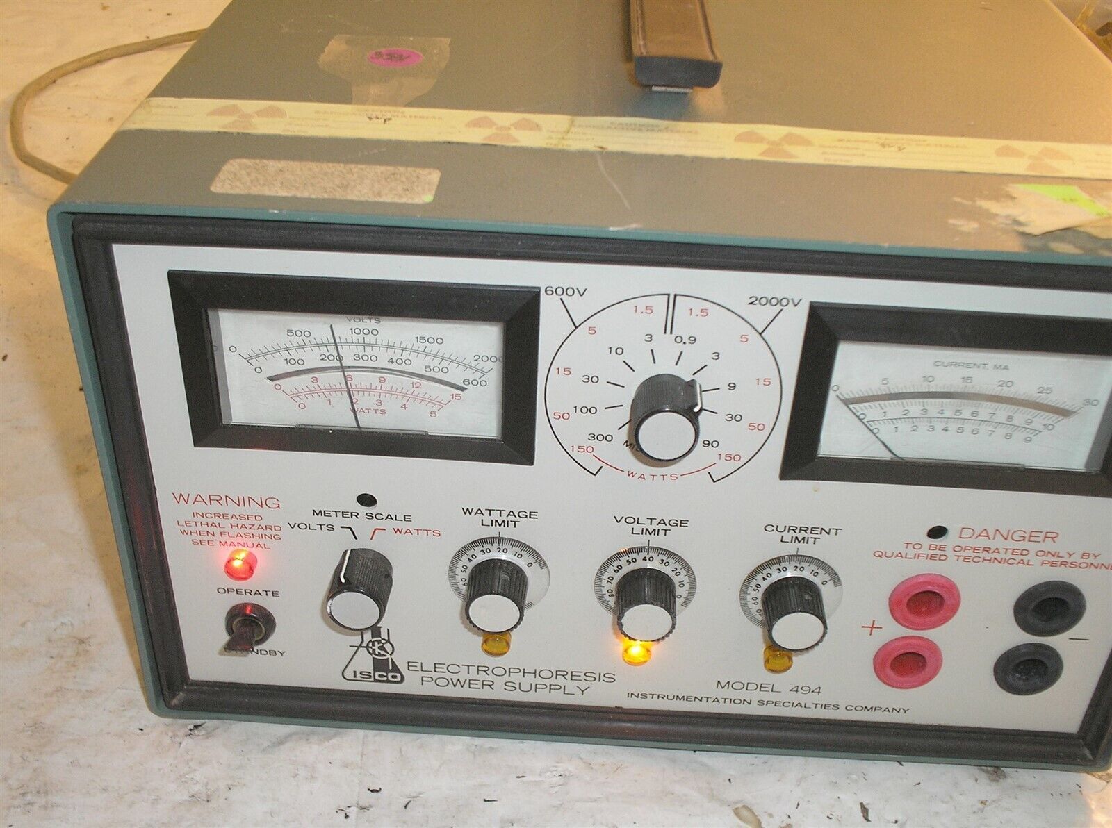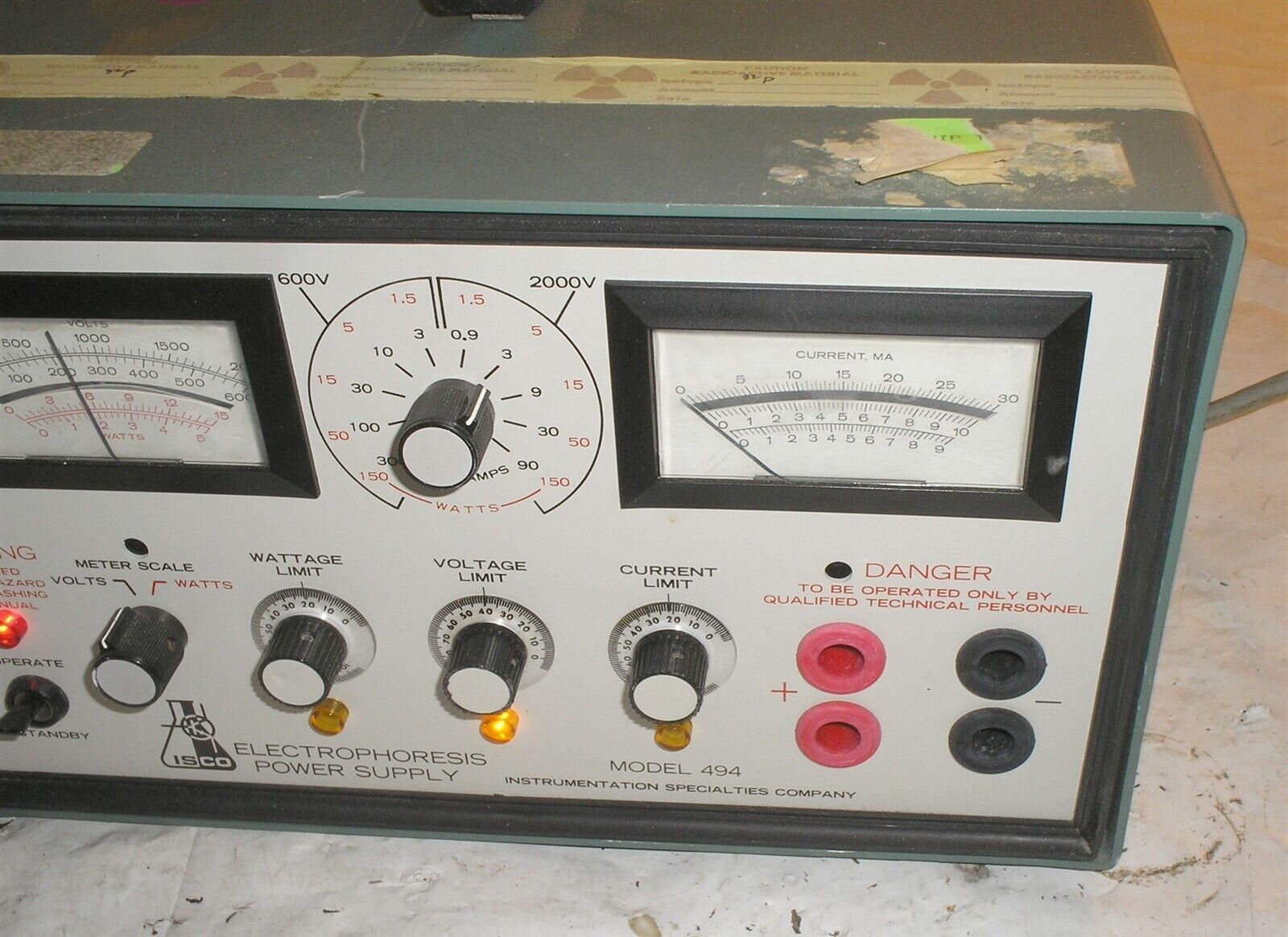 ISCO Electrophoresis Model 494 Power Supply. Item powers on and responds to inputs. Item appears to be in good physical and working condition. Please view photos.