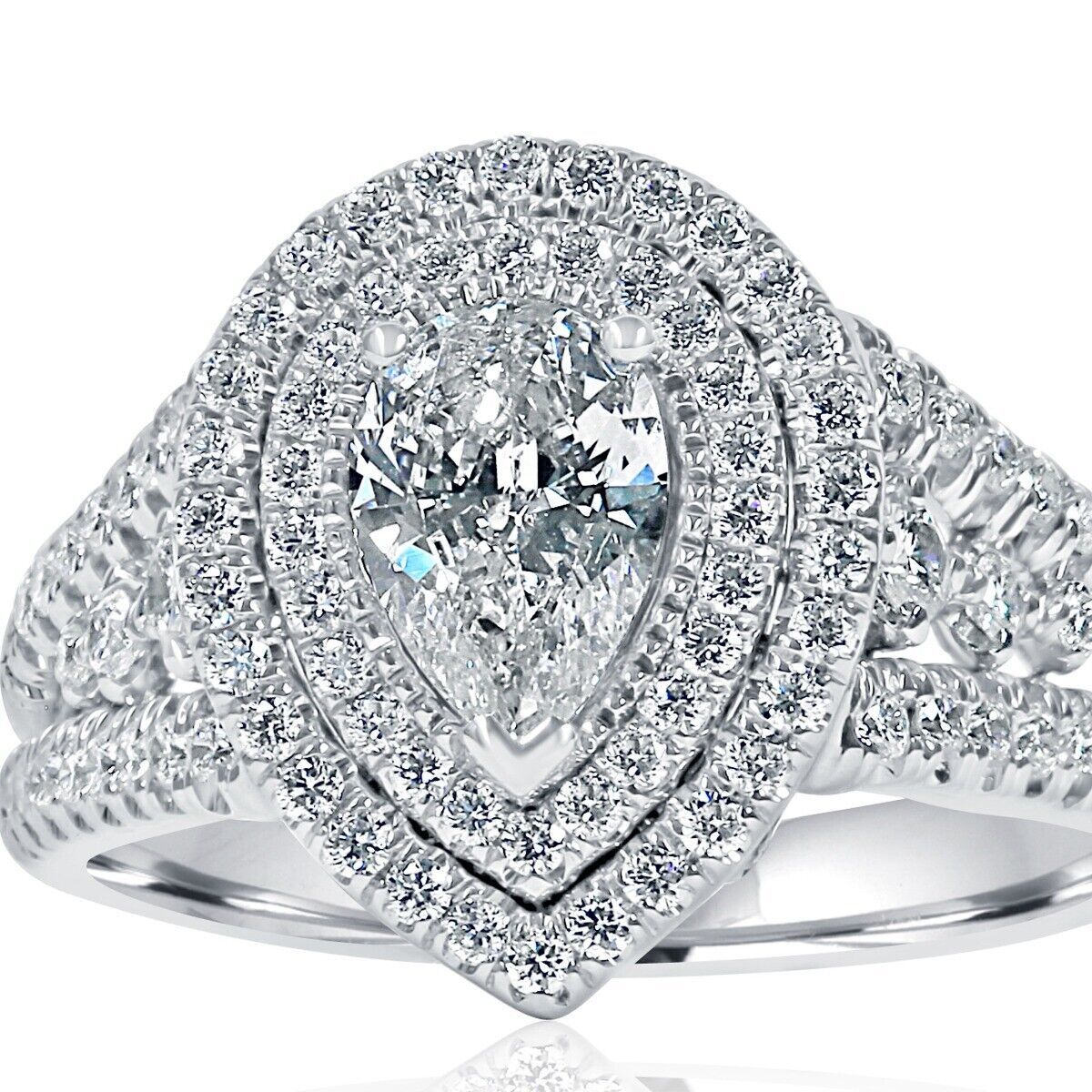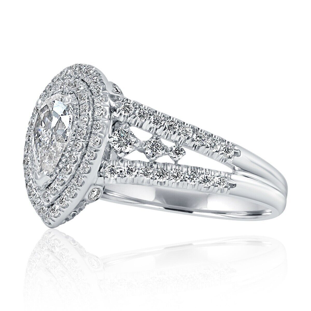 Art deco design diamond engagement ring showcases a 0.78 carat pear cut natural diamond center surrounded by a double halo of glittering colorless round cut diamonds in micro pave setting. Additional diamonds line the three row split shank with graduated diamonds adding an extra beauty to the design. Handcrafted of 14-karat white gold and completed with a high polish finish. It's a perfect way to say- I Love You - with this gorgeous diamond ring. The total carat weight is 1.59 carats.