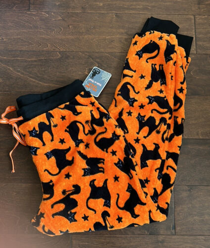 Pillow Talk womens Halloween Black Cat Print Plush Pajama Pants New Orange S