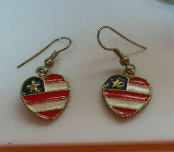 Vintage Enamel US Red White Blue Flag Heart Hook Earrings
