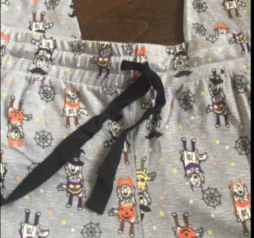 Very cute Halloween themed pajama pants with spiderwebs dogs all over. Pants have elasticized waist and Functional drawstring. Also has 2 front pockets on either side . Fabric is 95% polyester 5% spandex