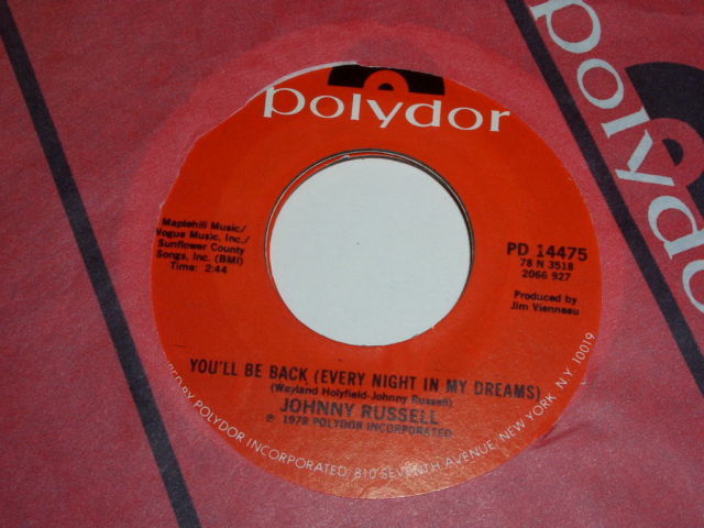 This is the original, vintage 45 rpm release of, "Is Anybody Leaving San Antone" by Johnny Russell. Flipside: "You'll Be Back Every Night In My Dreams". Record label Polydor PD 14475. Comes with the original Polydor paper sleeve making this all the nicer.