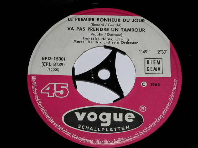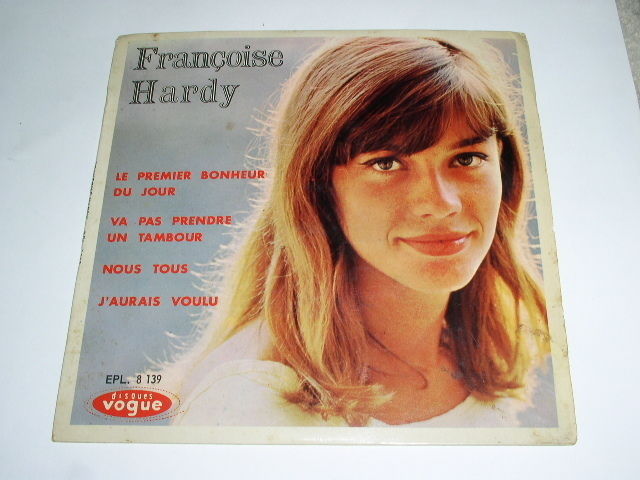 This is a vintage German import phonograph record by Francoise Hardy. Title: "Le Premier Bonheur/Du Jour/Va Pas Prendre un Tambour". Flipside: "Nous Tous/J'Aurais Voulu". Record label: Vogue EPL. 8 139.