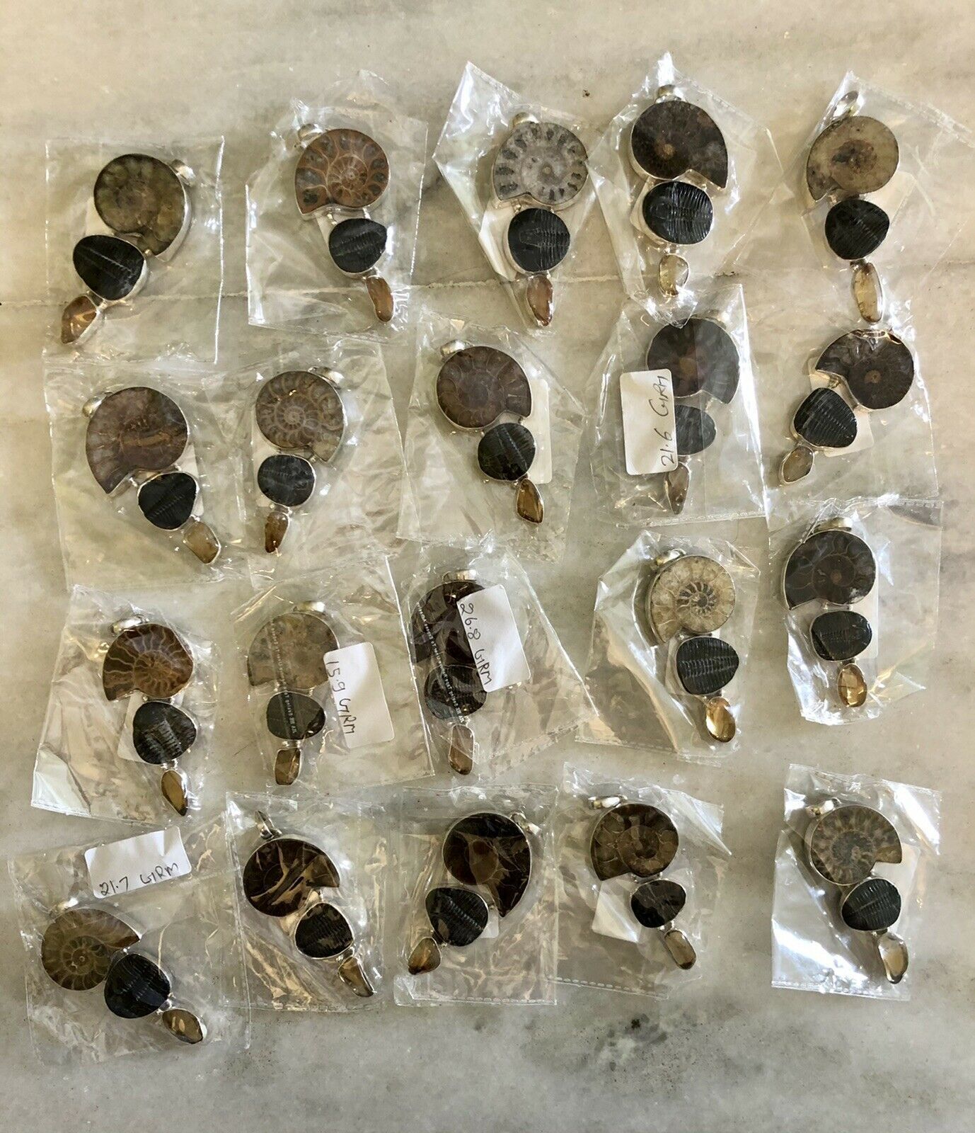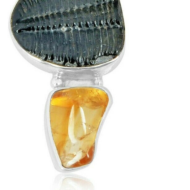 Colgante de joyería de amonita, ámbar y trilobites de plata de ley