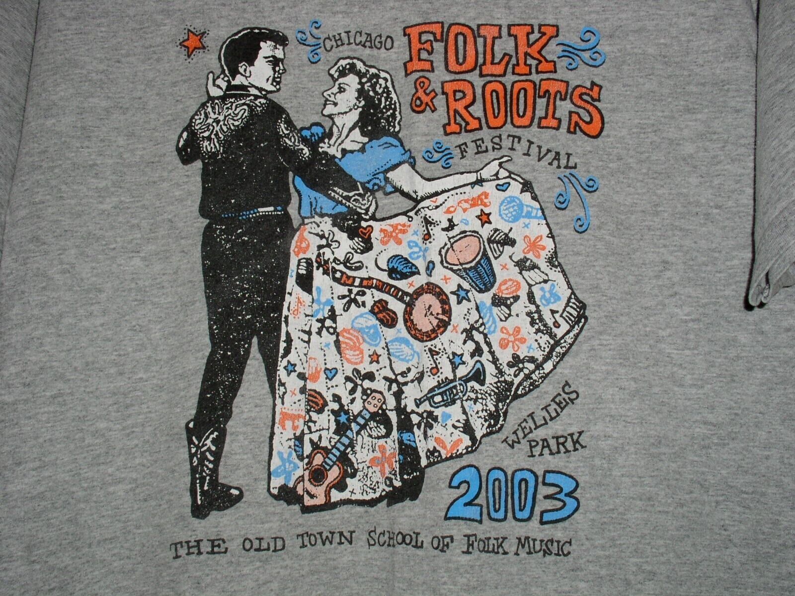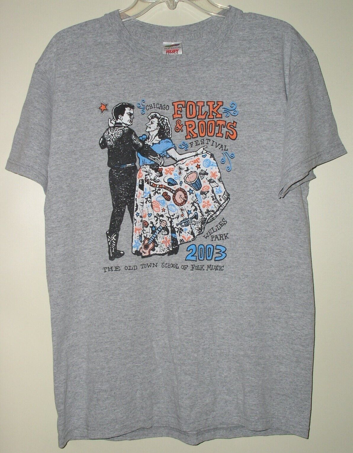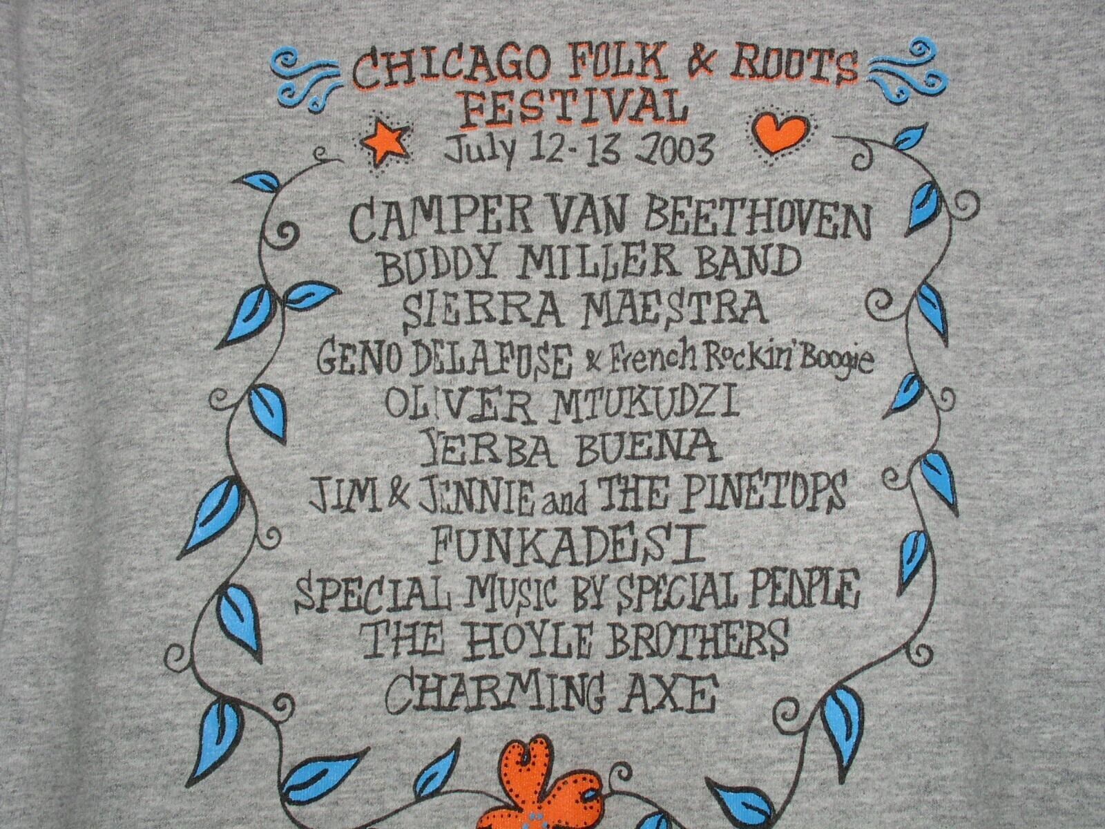 This is a concert t shirt entitled, "Chicago Folk Roots Festival, July 12-13, 2003". Held at Welles Park. Tag reads: Fruit of the Loom Heavy Cotton. A terrific item for the fan or collector.