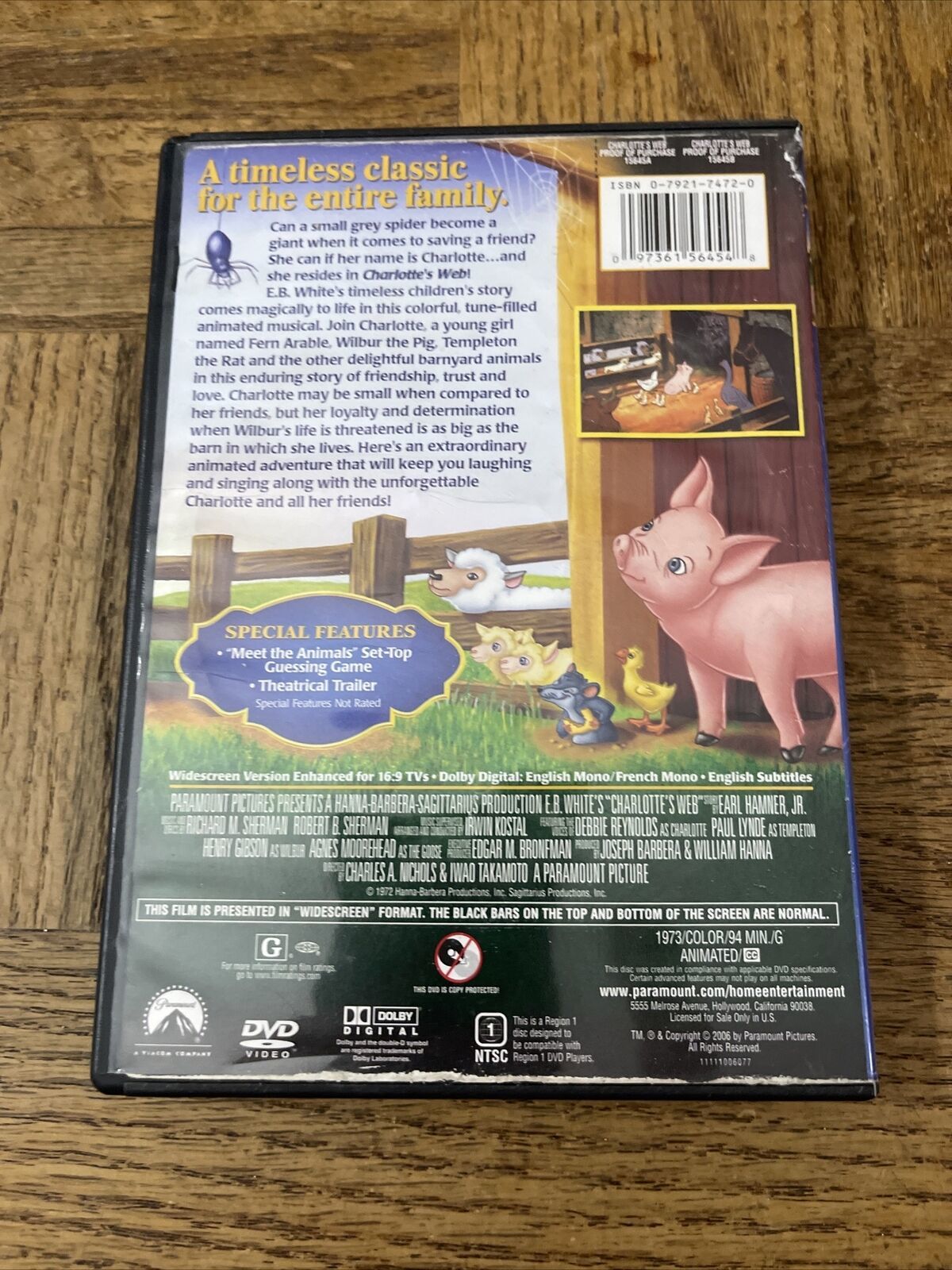Charlotte's Web DVD is a heartwarming tale of friendship and adventure. This classic movie is perfect for children and families who love to watch animation/anime films. The movie is directed by Charles A. Nichols and Iwao Takamoto and features a G rating suitable for all ages.