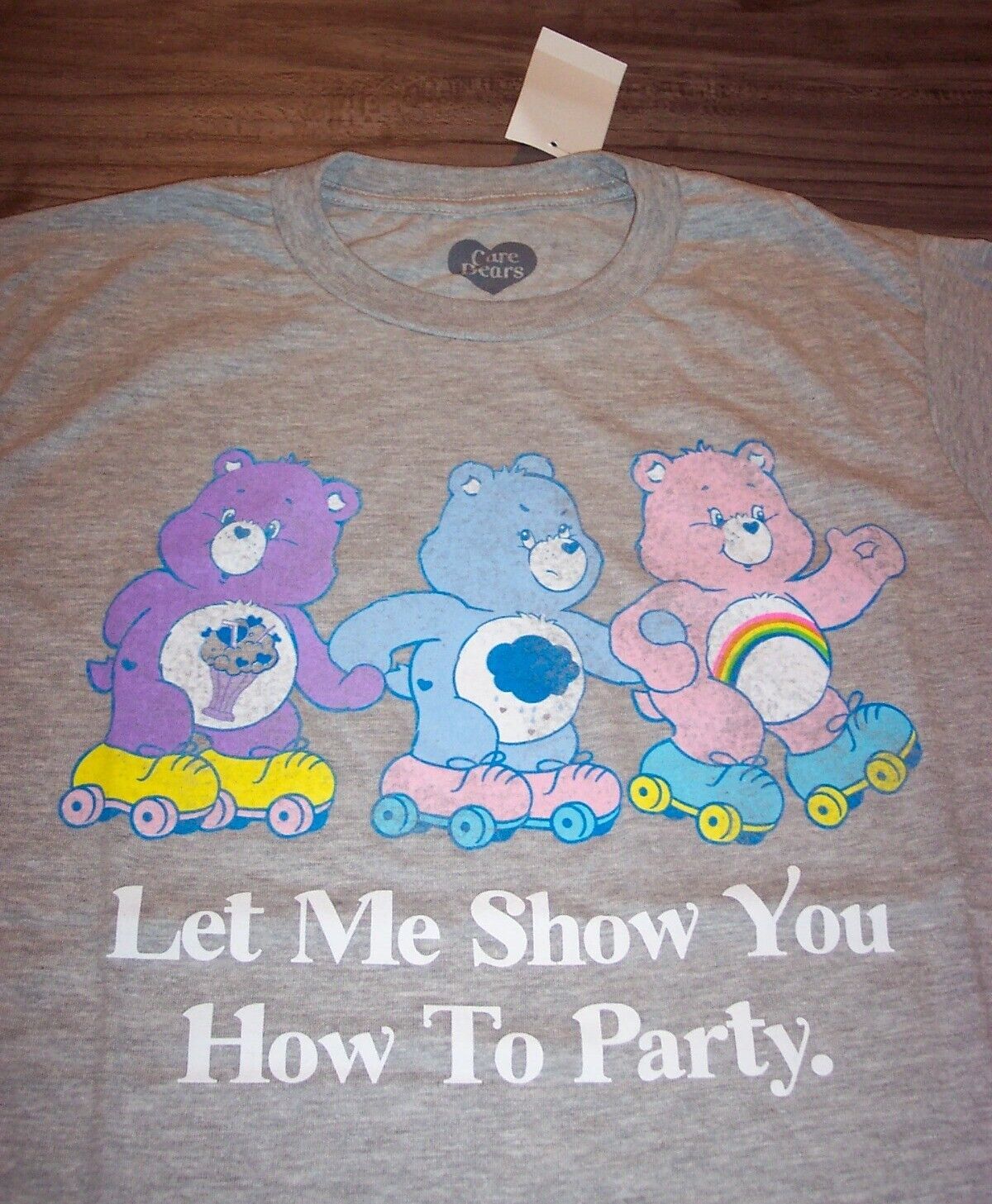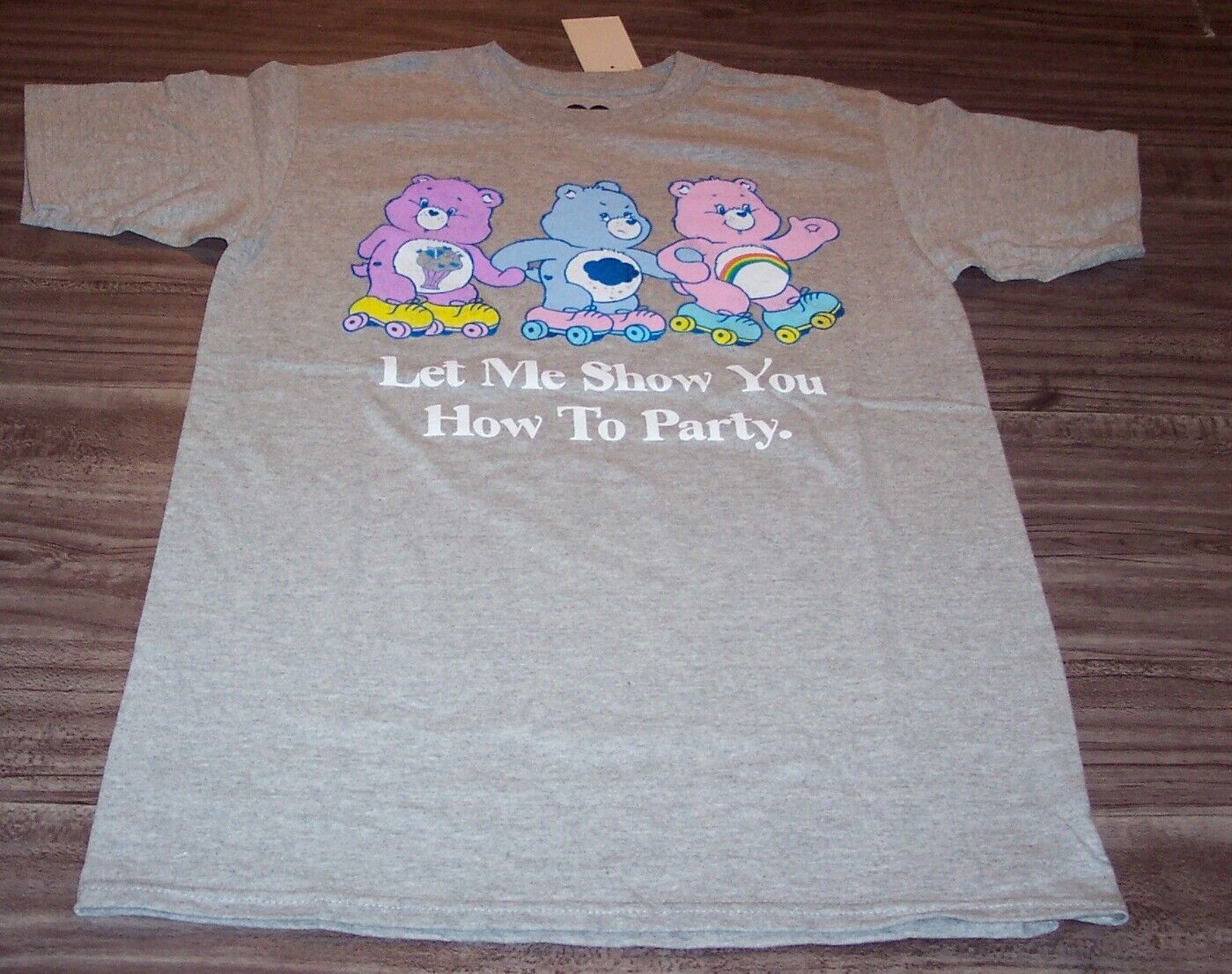 This is a Vintage Style CARE BEARS "LET ME SHOW YOU HOW TO PARTY" Share Bear Cheer Bear Grumpy Bear T-shirt. It is a size SMALL and it is NEW with the tag. It is 18 inches from armpit to armpit and 27 inches in length. Combine auctions to save on shipping. D2AD