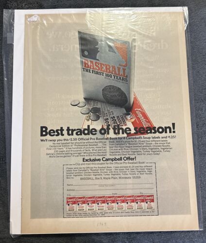 1969 Campbell's Kids Soup Advertising Page In Plastic Cover 100 Yrs Baseball