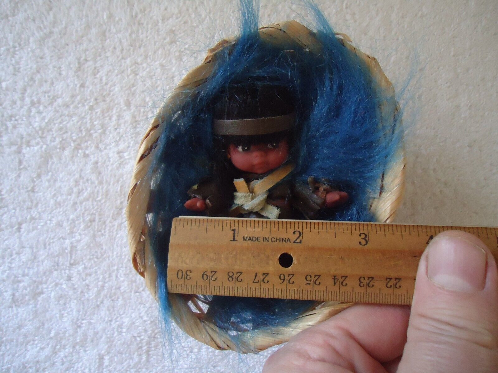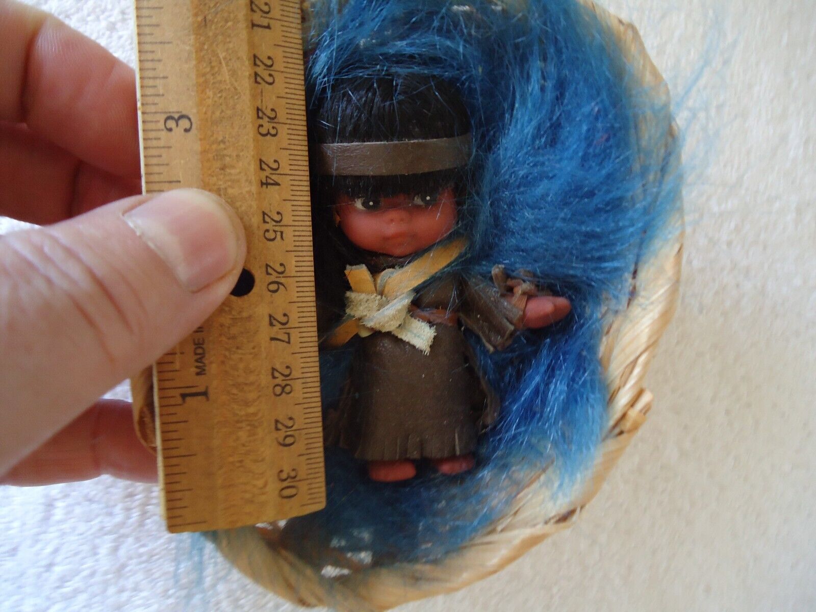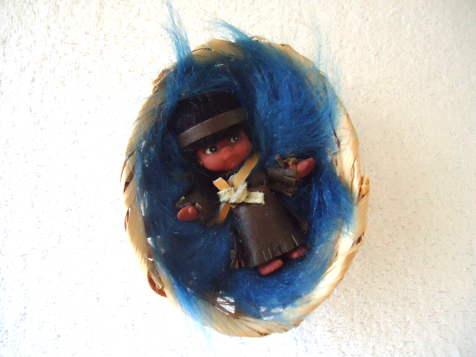 Here is a Vintage Small Native American Papoose Toy Figurine In Woven Basket " Great Collectible Item ".This is a must for any collector,or decorator wanting that vintage retro look.The pics do not do this item(s) justice.If you have any concerns or questions about this item(s) please ask before bidding / purchasing because this item(s) is being SOLD AS IS.Thank You.-(PC212)