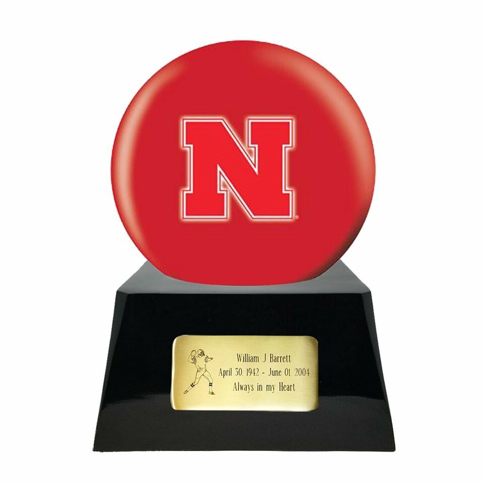 The item you are looking at is our Number 034-IUKR206, a large/adult sized, black colored metal cremation urn base displaying a Nebraska Cornhuskers team ball.