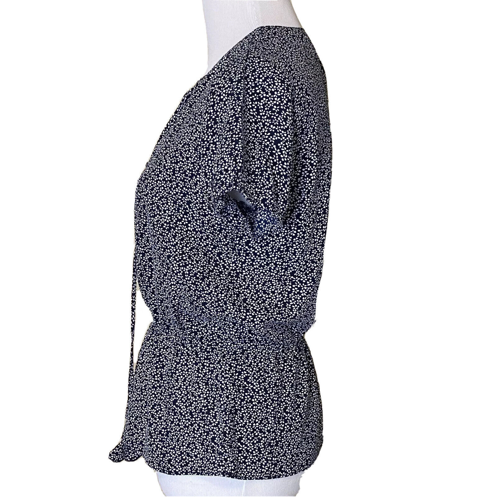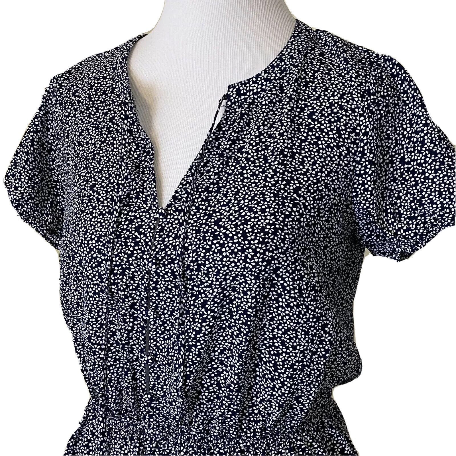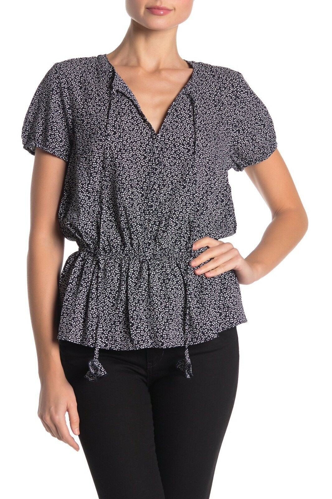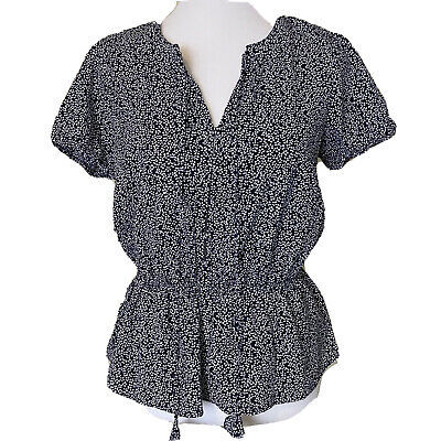 New &. Layered Blouse Womens XS Keyhole Puff Sleeve Peplum Navy White Mini Daisy