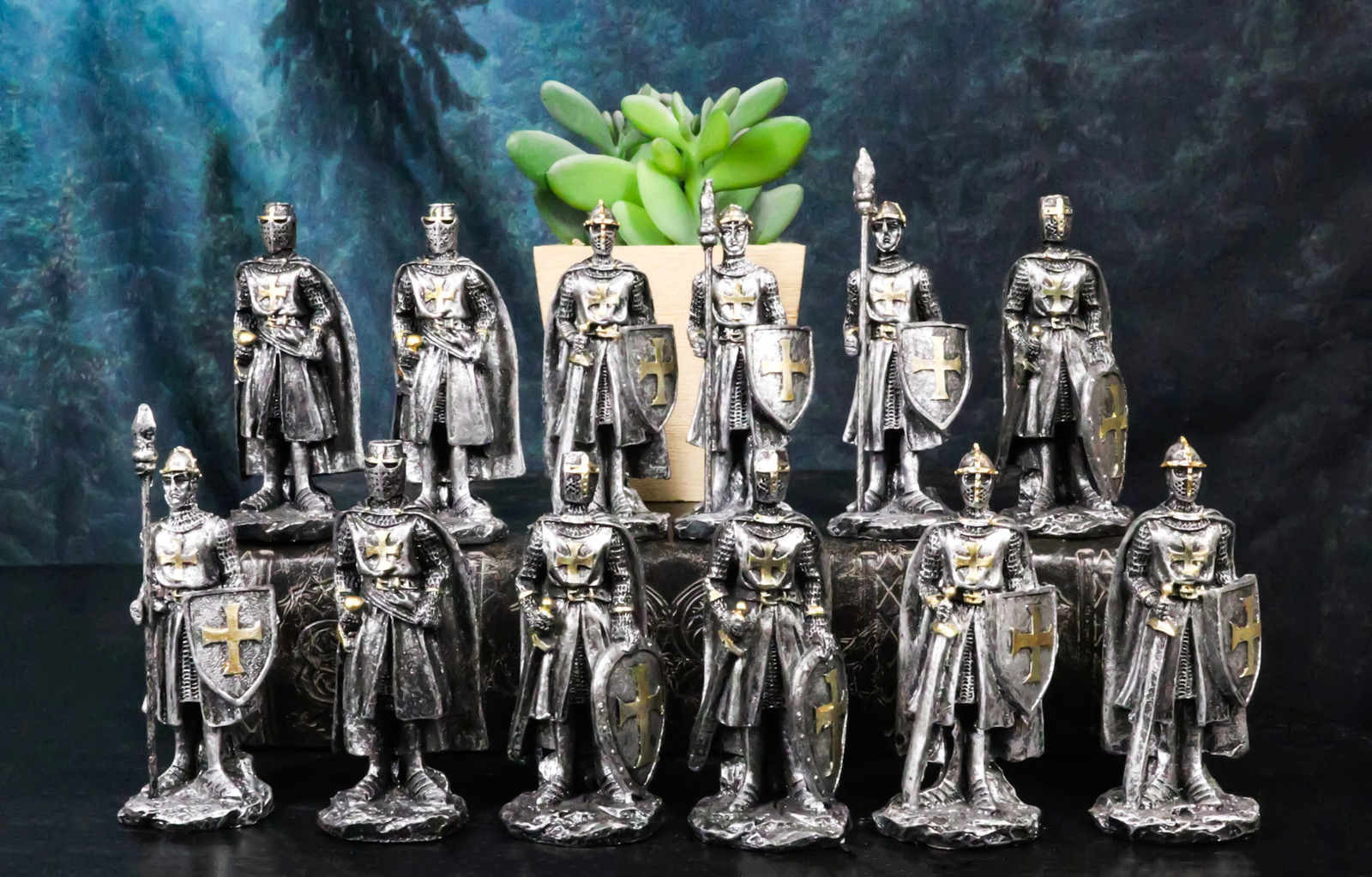 ? Complete your dollhouse miniature medieval castle collection with these suit of armor knight figurines! Designed in the classical medieval/renaissance era armor, each knight is standing on foot. Wearing their Knight of The Cross Cloaks, they carry shields of faith, pole spears and battle swords. The set comes as a pack of 12 mini figural knights in 4 different poses/styles as pictured.