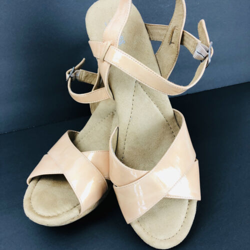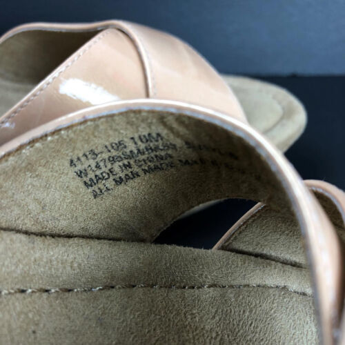 Bass Platform Wedge Sandal 10M Beige Patent Leather Buckle Straps Cork Heel Shoes