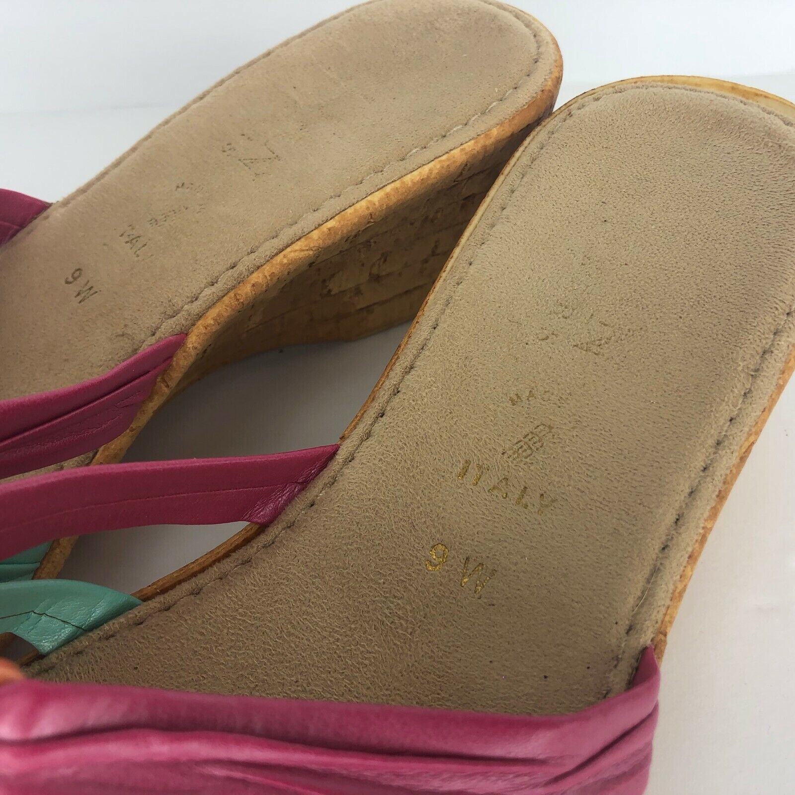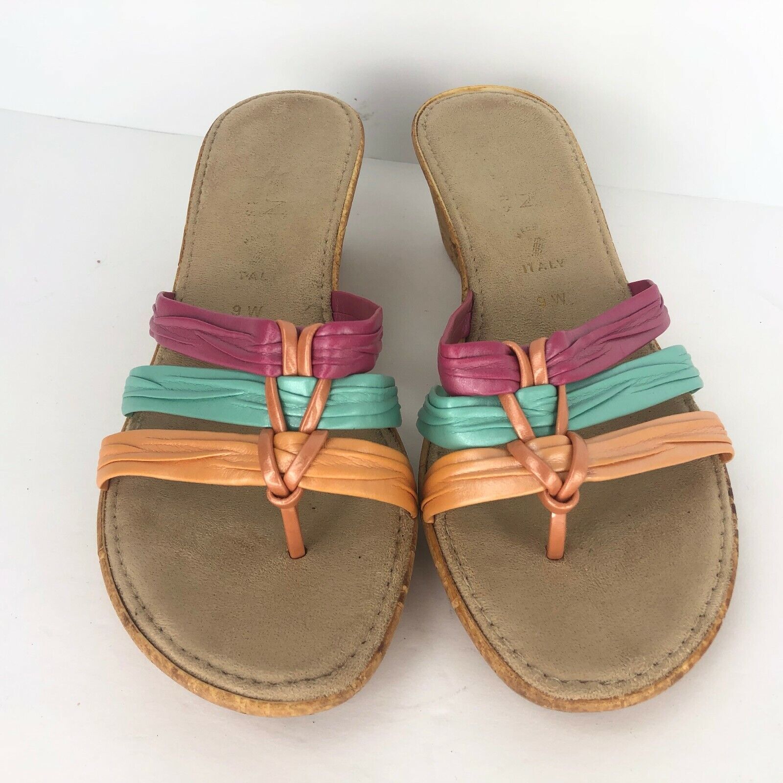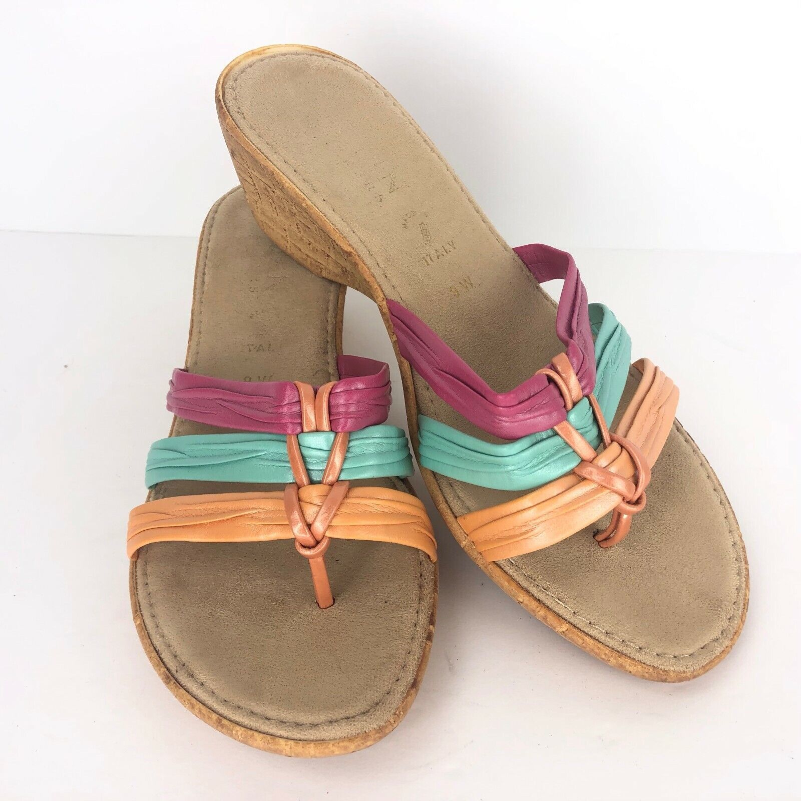 Italian Shoemaker Wedge 9 W Pink Green Orange Metallic Slides Cork Look Sandal