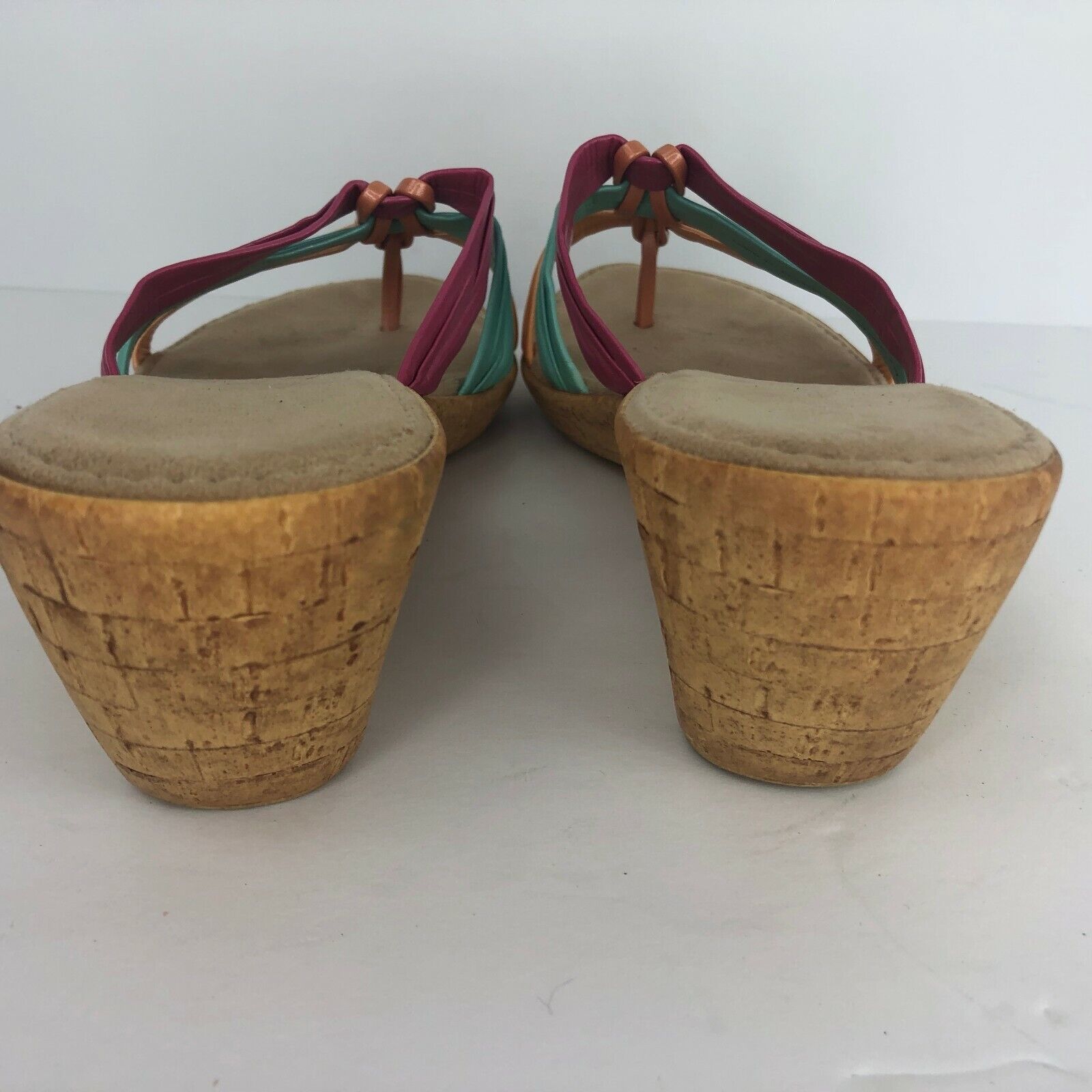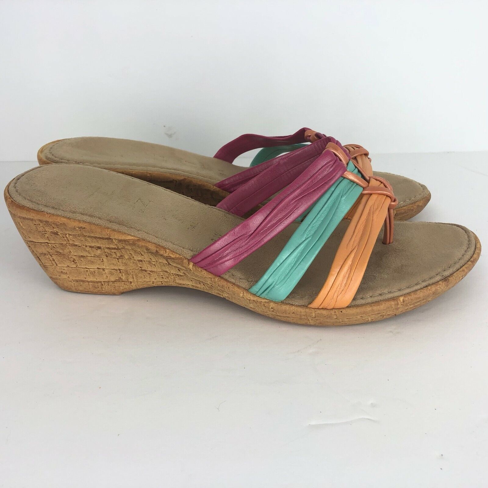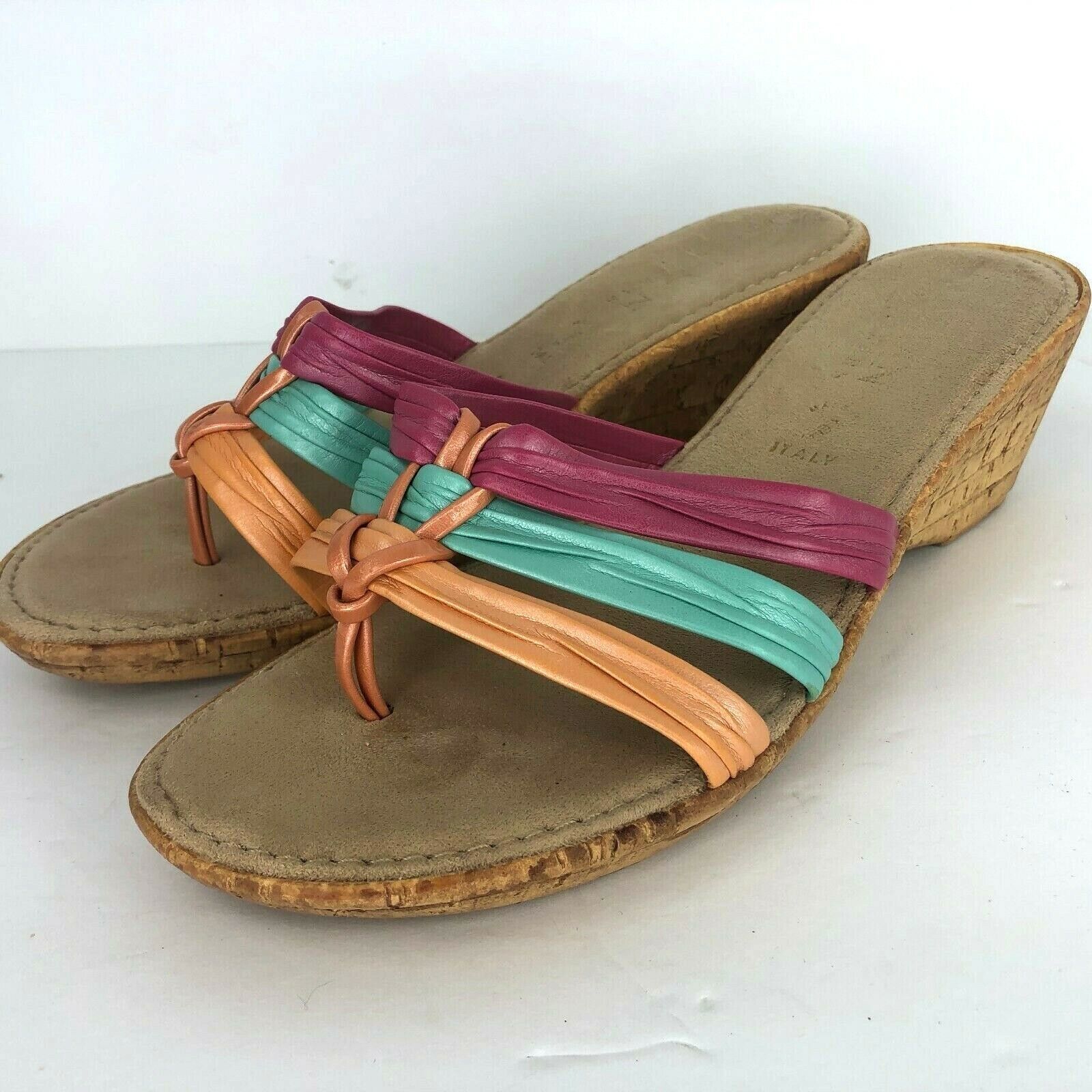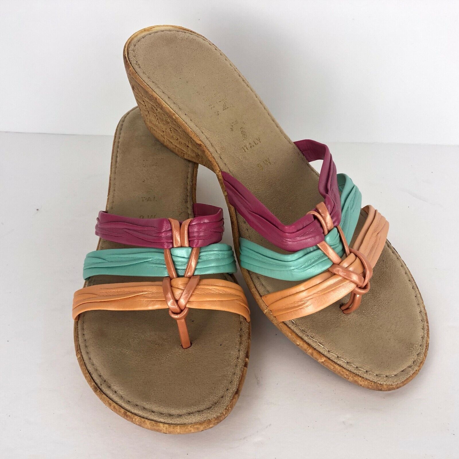 Italian Shoemaker Wedge 9 W Pink Green Orange Metallic Slides Cork Look Sandal