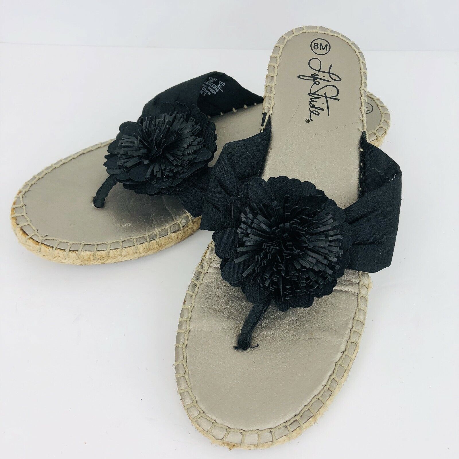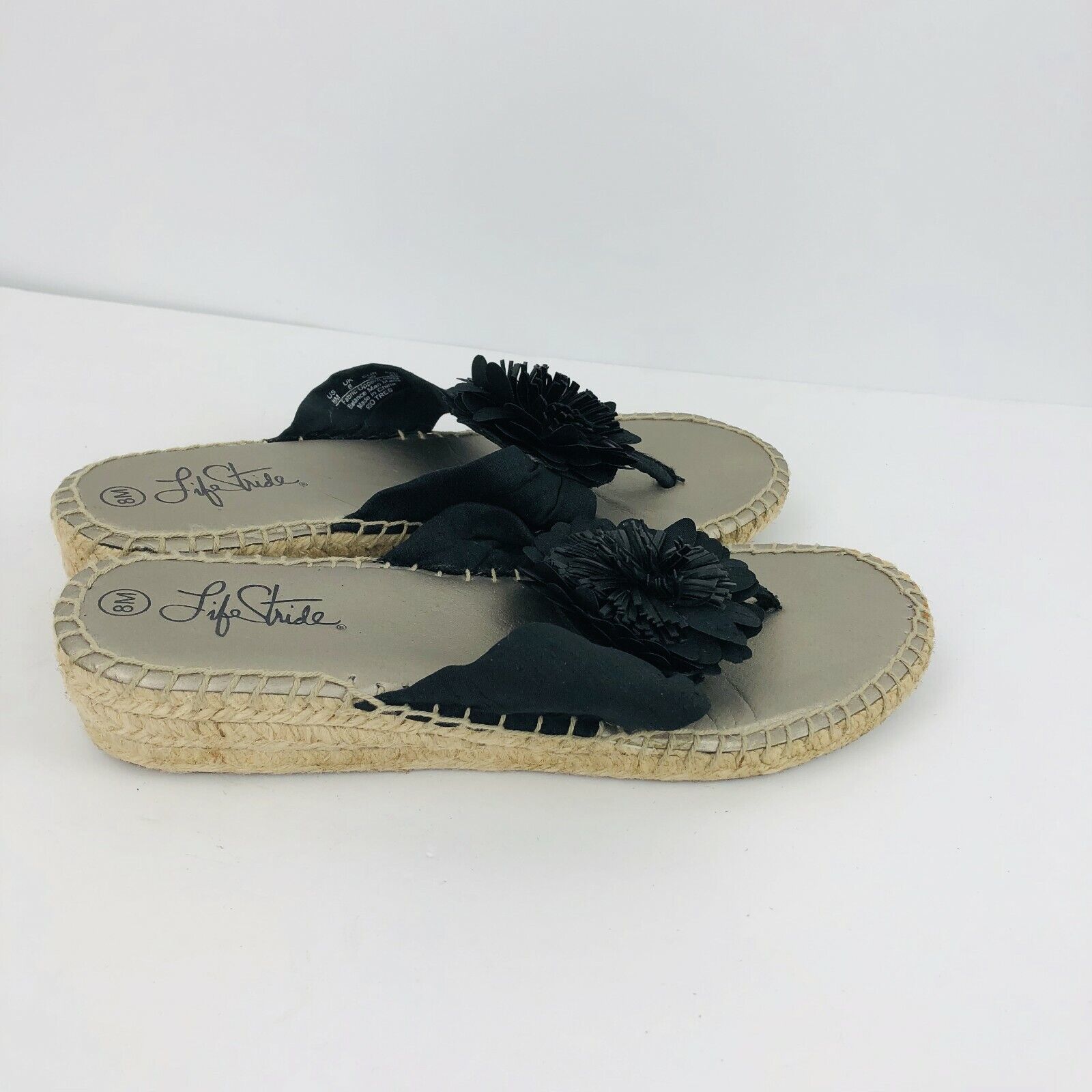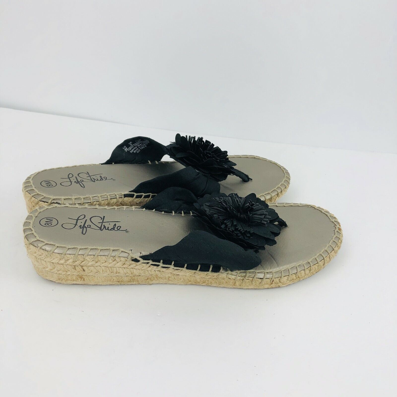 Life Stride Rio Tres Espadrille Size 8 Sandal Flip Flop Black Flower Hemp Shoe