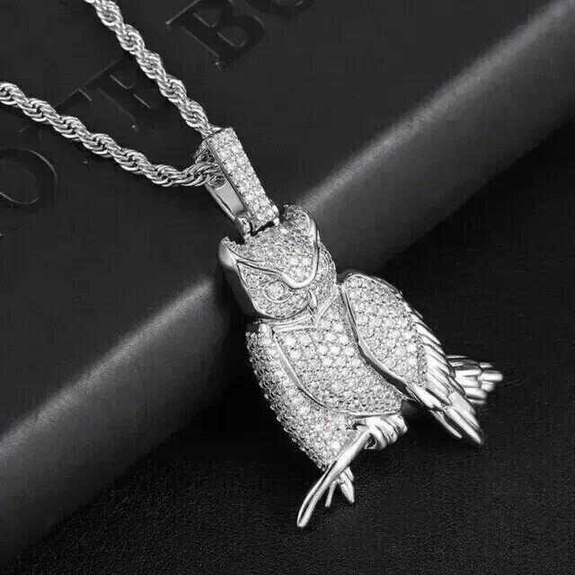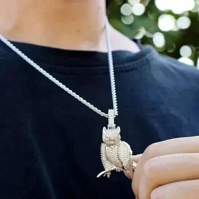 2Ct Round Cut Lab-Created Diamond Owl Charm Men's Pendant 14K White Gold Plated