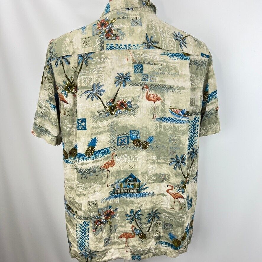 Campia Moda Hawaiian Aloha L Shirt Palm Tree Flamingos Tiki Bar Pineapples Tapa