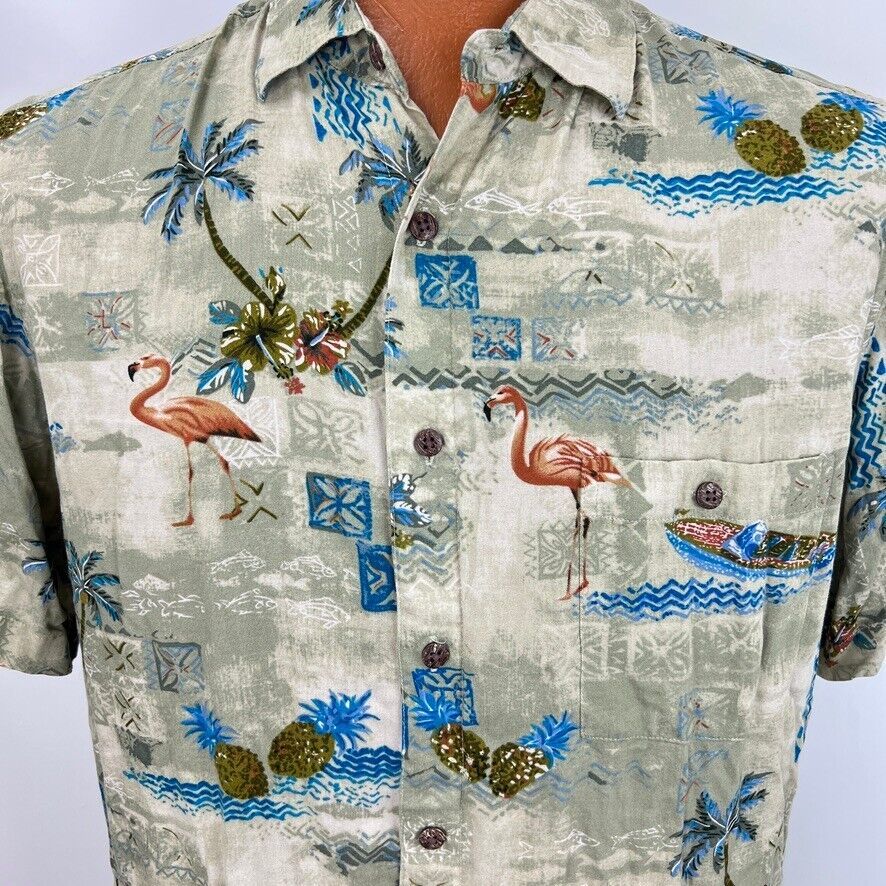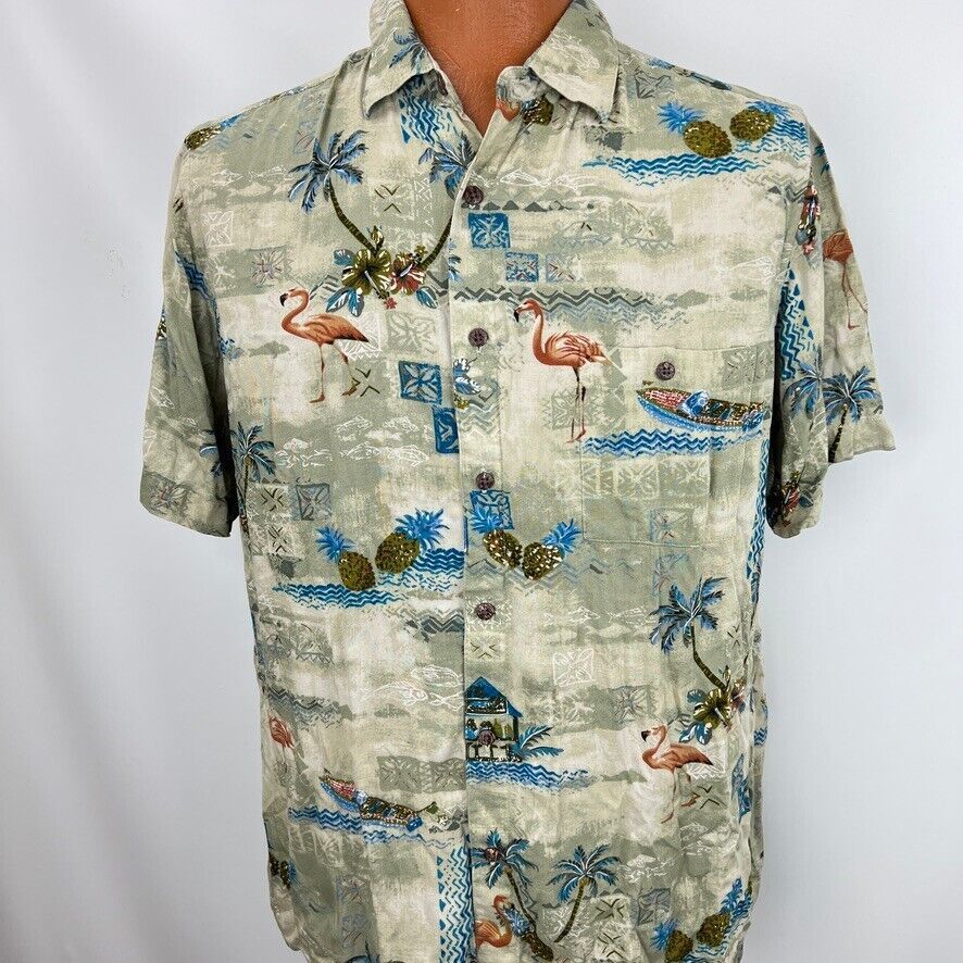 Campia Moda Hawaiian Aloha L Shirt Green Palm Tree Flamingos Pineapples Tapa