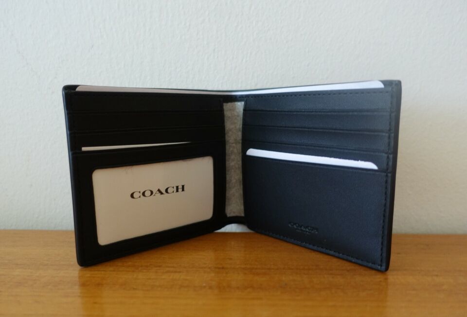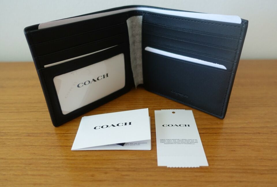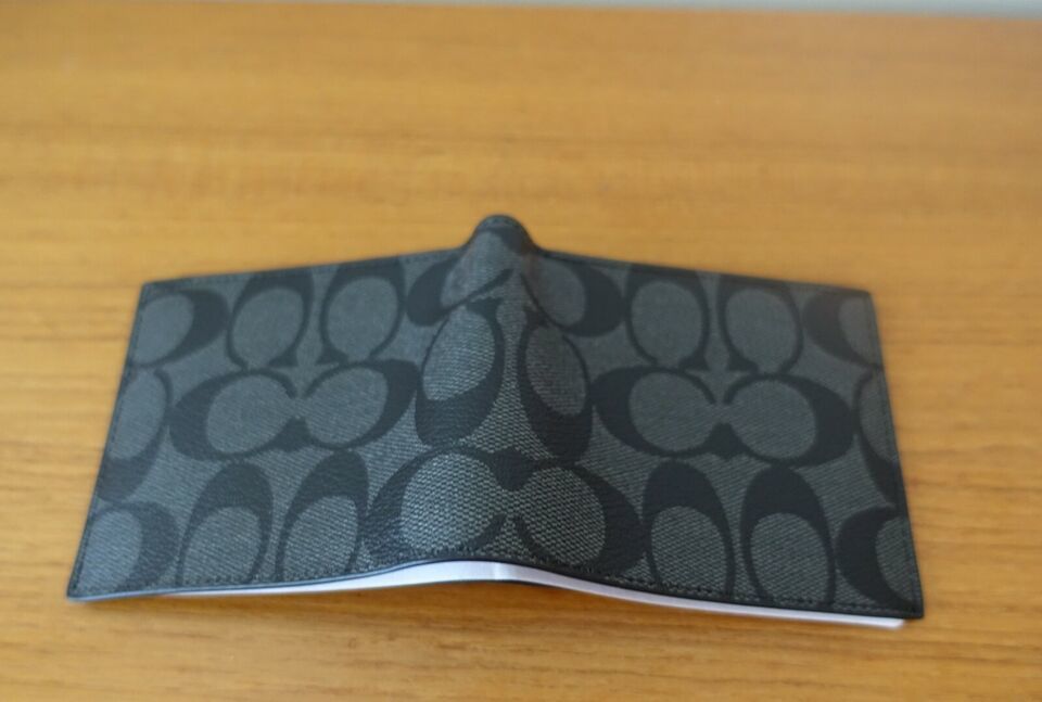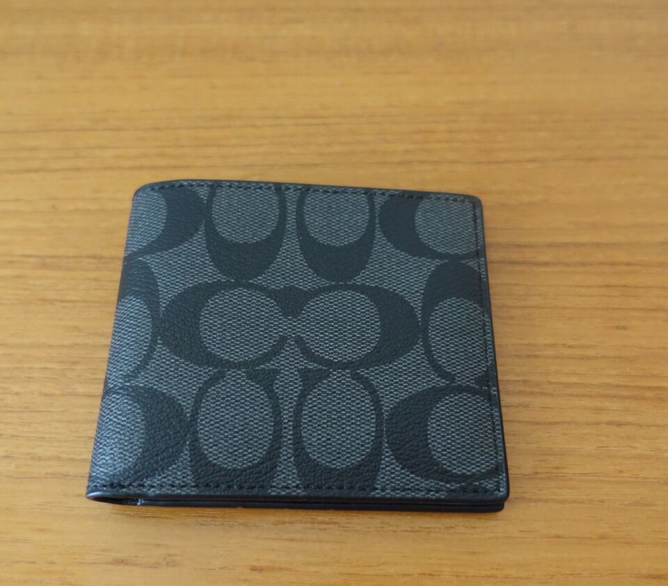 COACH MEN’S ID BILLFOLD WALLET IN SIGNATURE CANVAS IN CHARCOAL/BLACK/BLACK ANTIQUE NICKEL COLOR. NWT