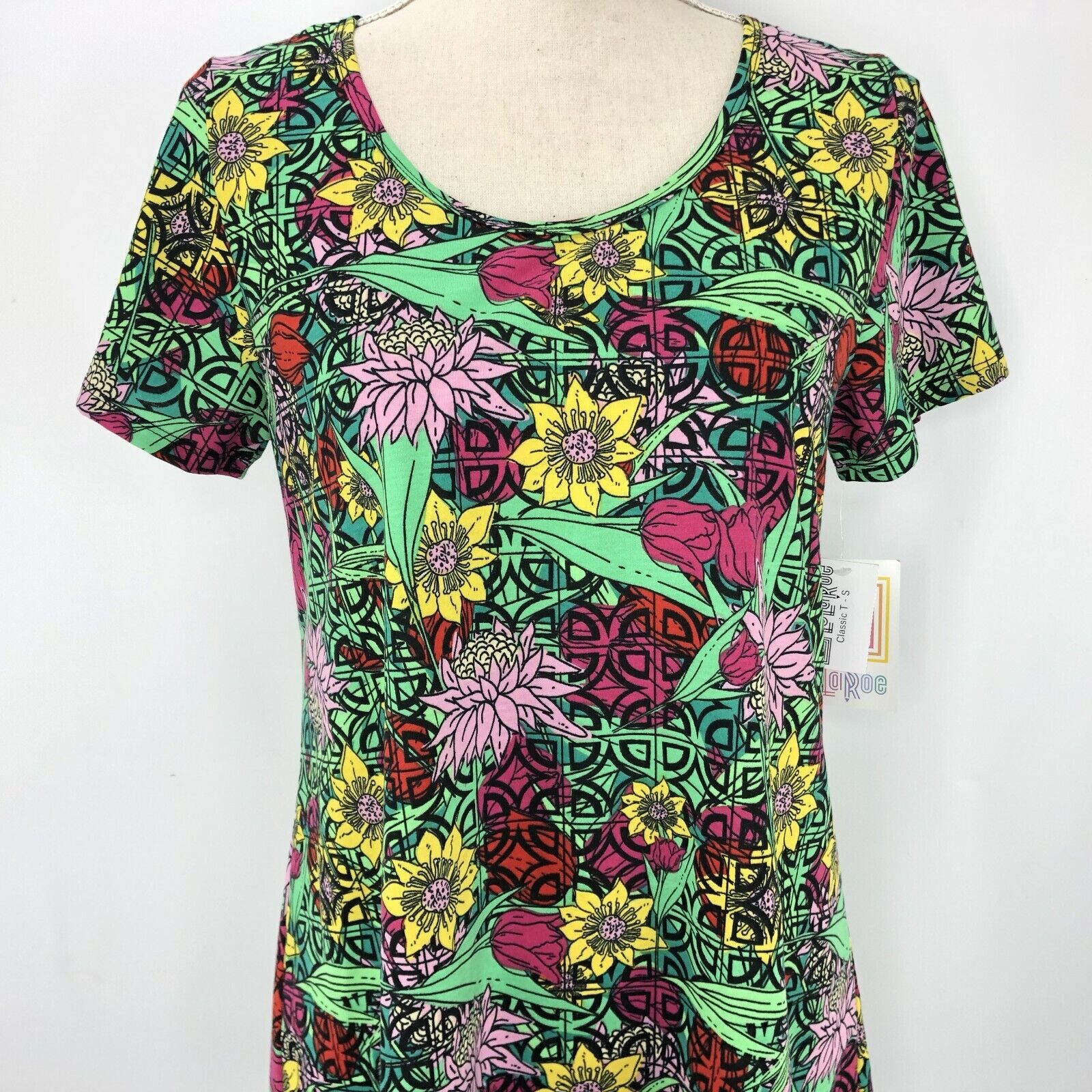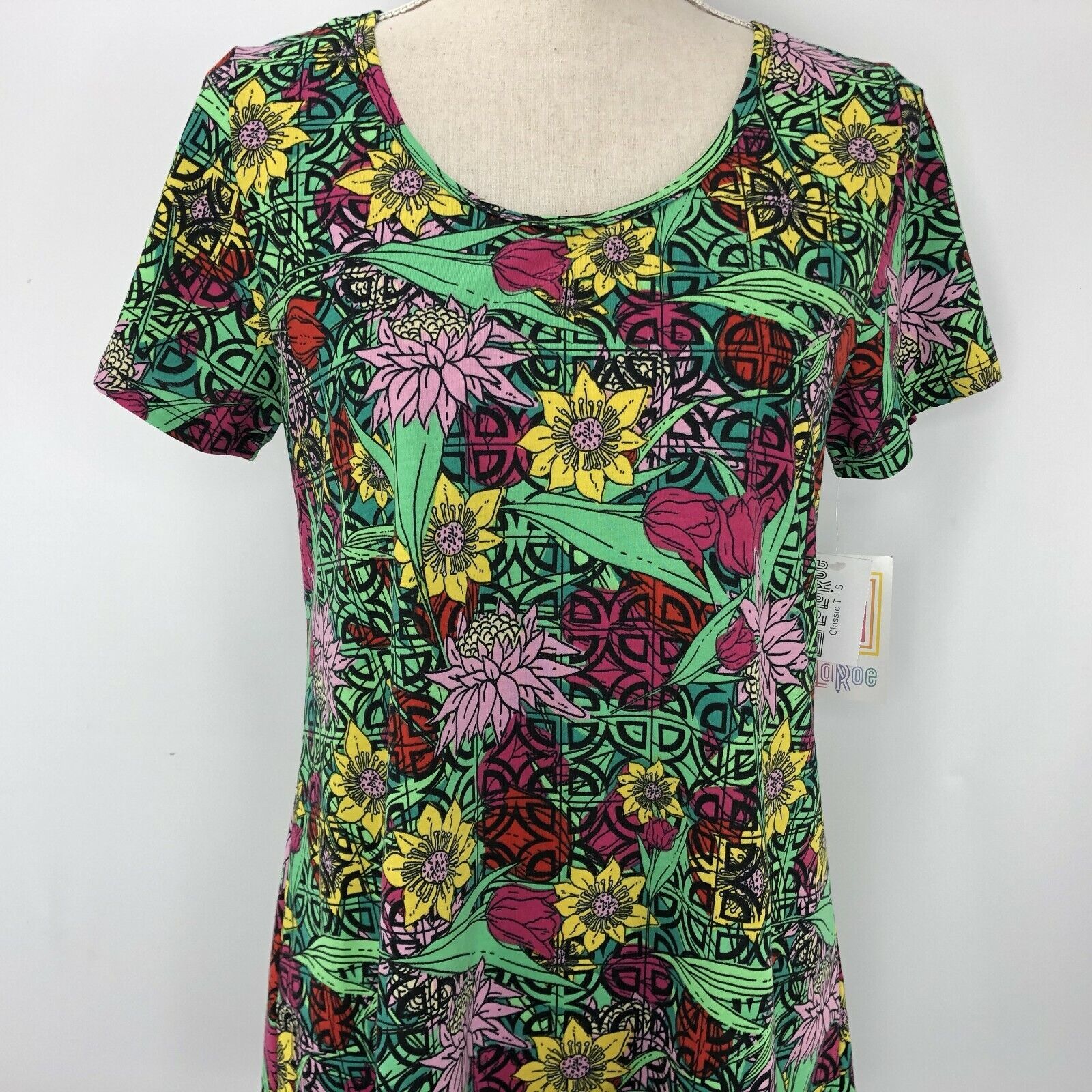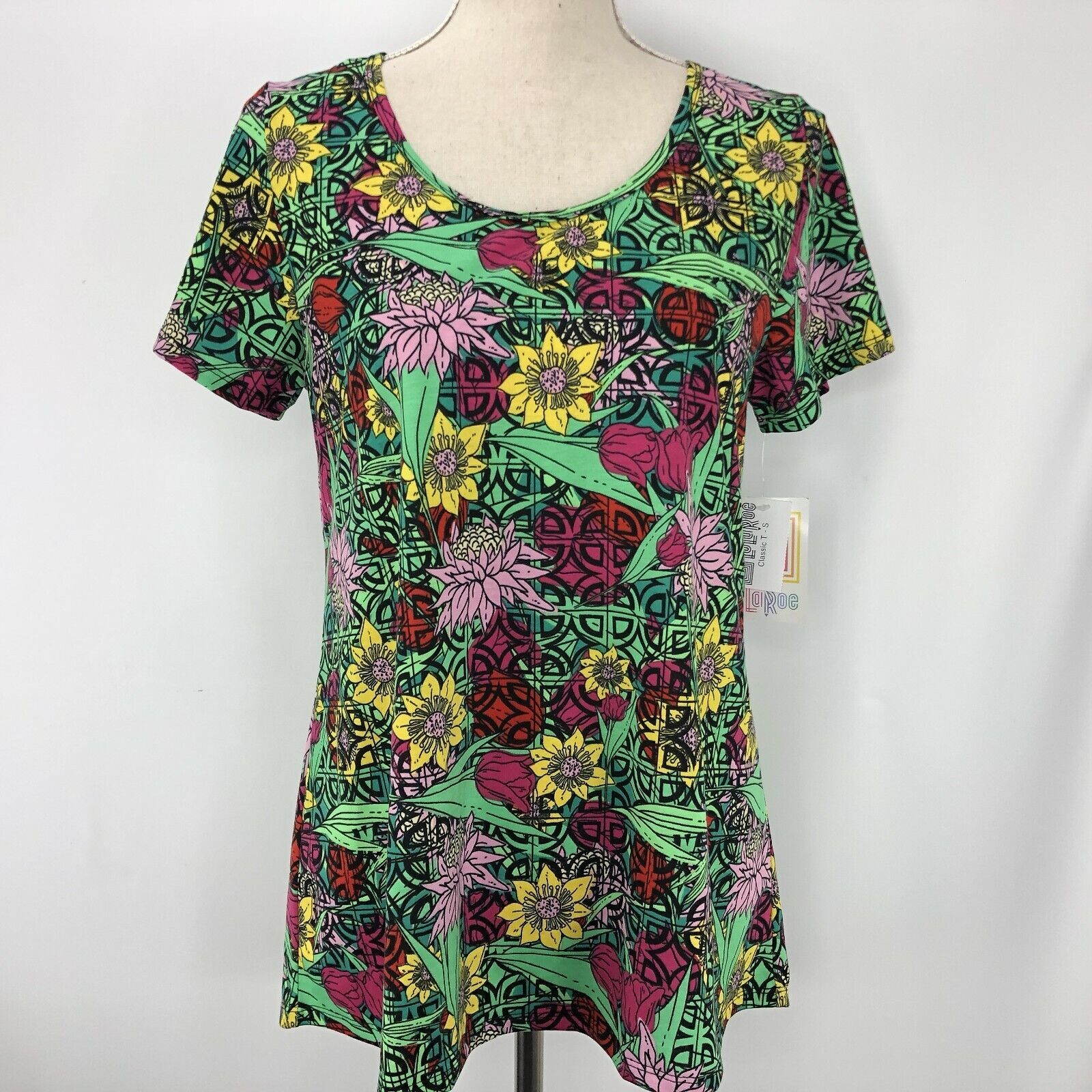 LuLaRoe Classic T Size Small Floral Green Pink Yellow Red Geometrics Shirt
