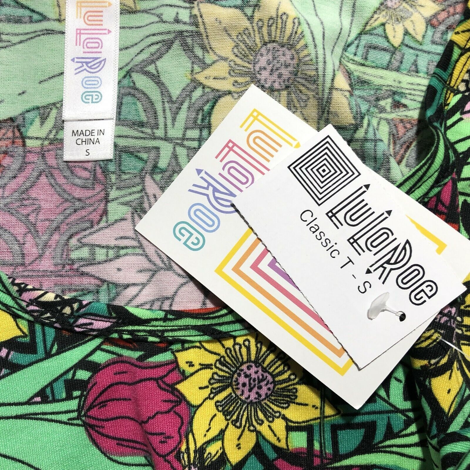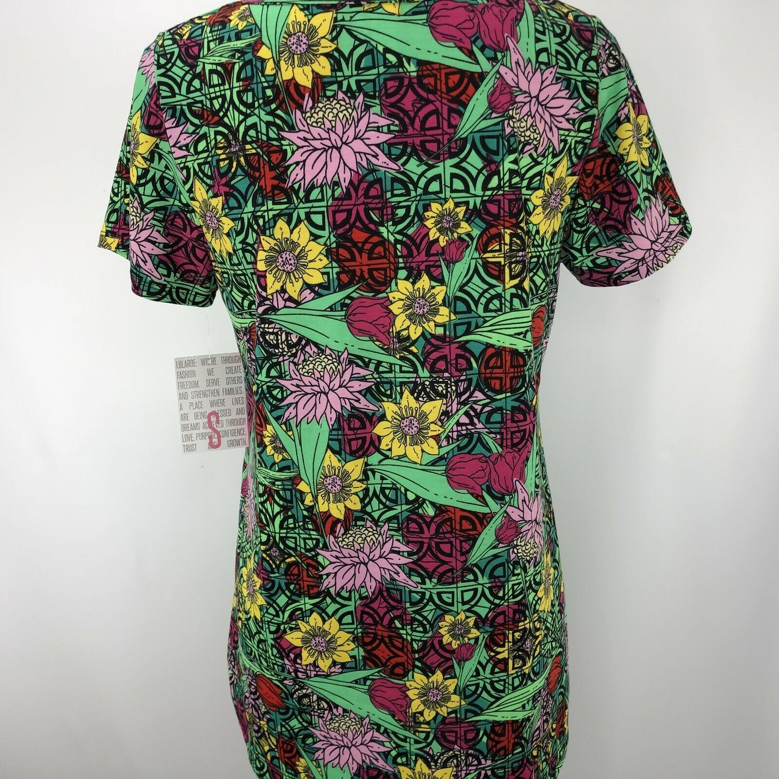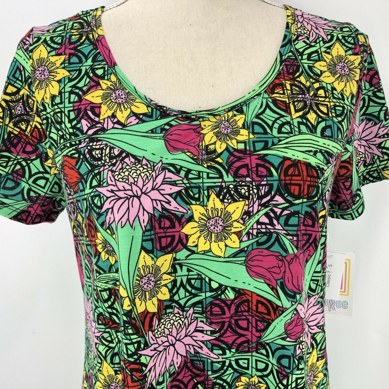 LuLaRoe Classic T Size Small Floral Green Pink Yellow Red Geometrics Shirt