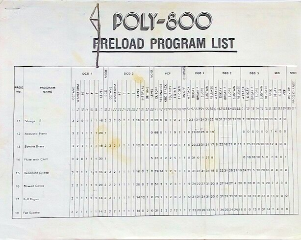 Preload Program List Sheets for the 80's Vintage Korg POLY-800 Synthesizer Keyboard