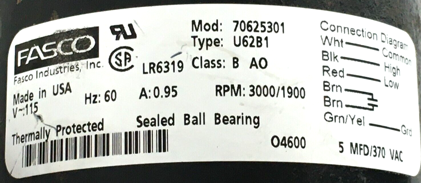 FASCO 7062-5301 Draft Inducer Blower Motor U62B1 115V 3000/1900 RPM used part.