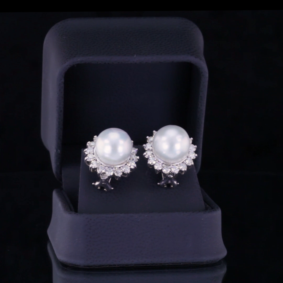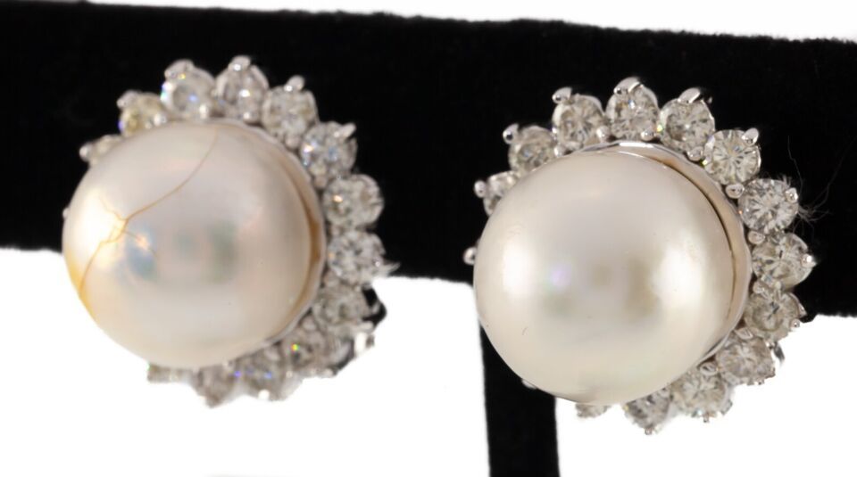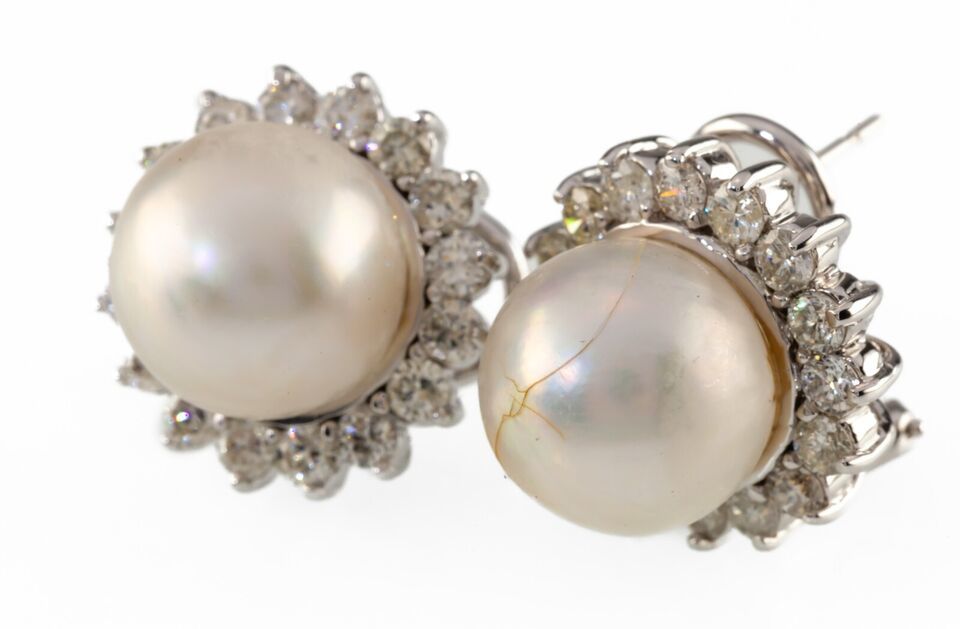 One pair electronically tested 14KT white gold cast assembled South Sea cultured pearl diamond earrings with omega backs.