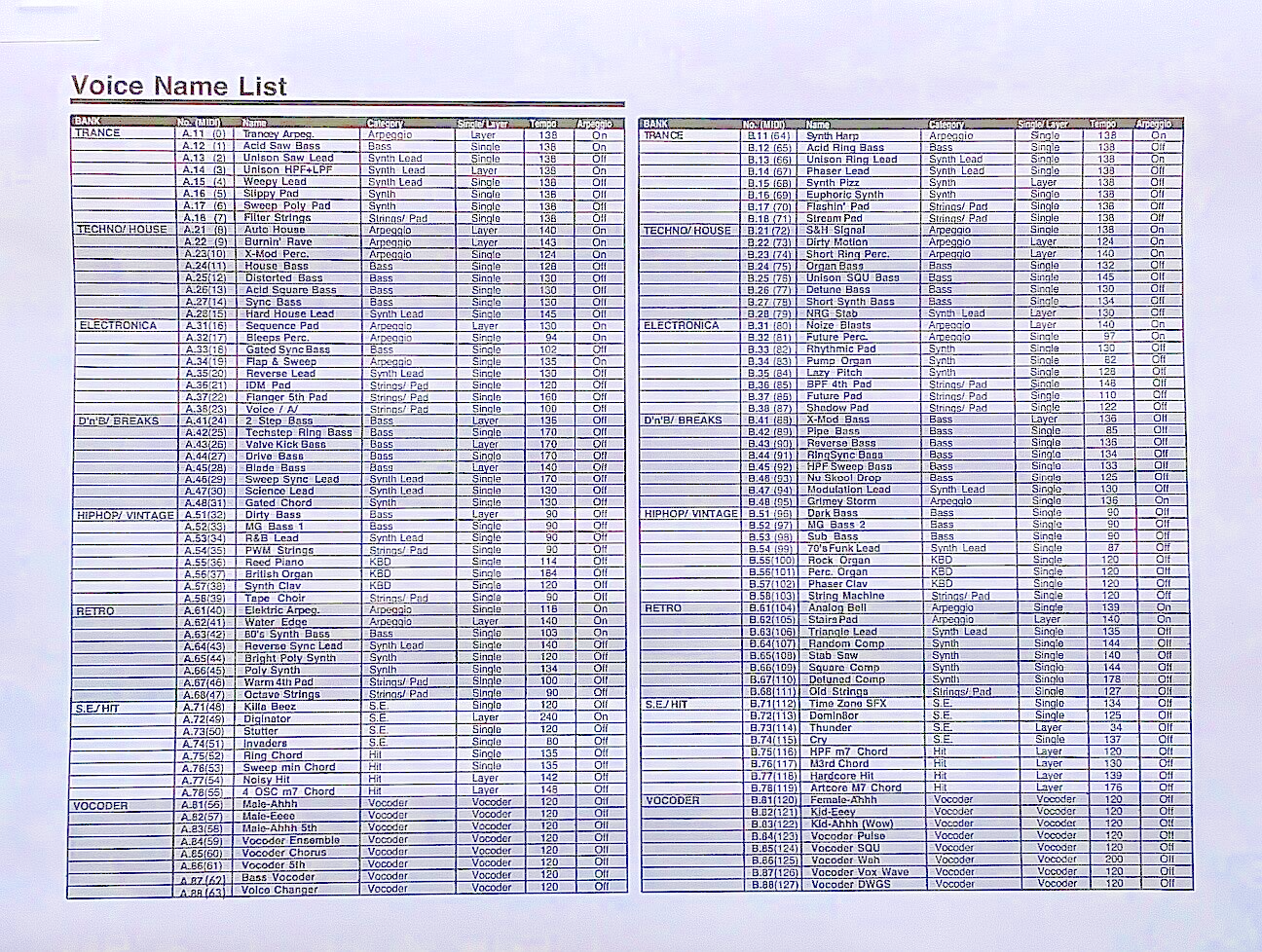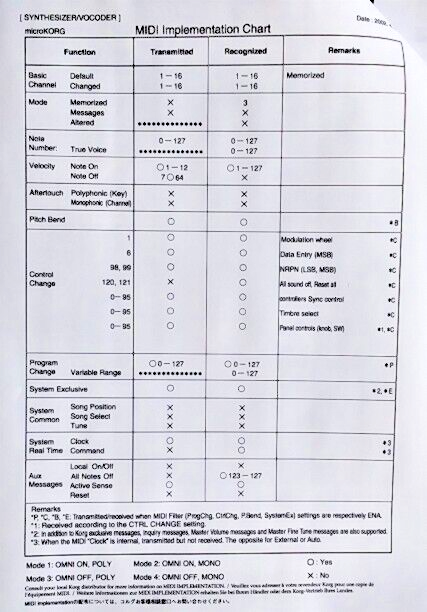 Korg MicroKorg Synthesizer Voice Parameter Lists, Midi Imp. Sheets, Reproduction