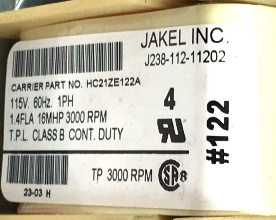 This is JAKEL J238-112-11202 Draft Inducer Blower Motor HC21ZE122A used previously, refurbished part, excellent working condition.