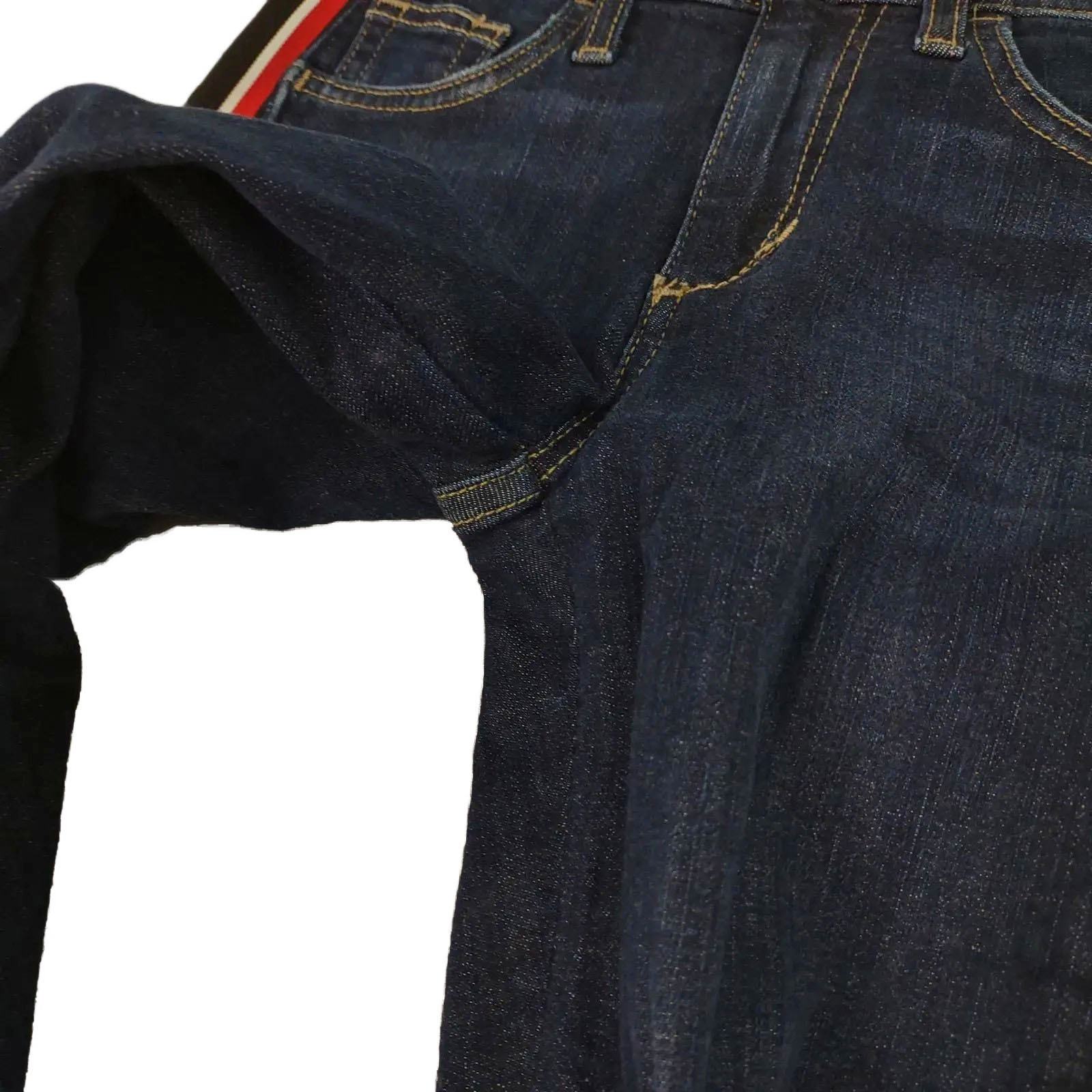 -Features: Tuxedo red/white/black racing stripes down the sides, skinny ankle leg, stretch denim, dark wash, 5-pocket, belt loops, zipper fly with top button
