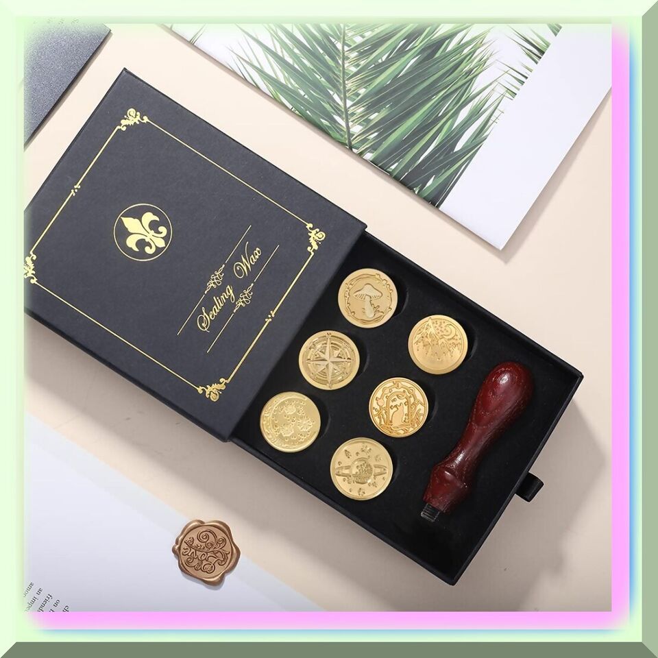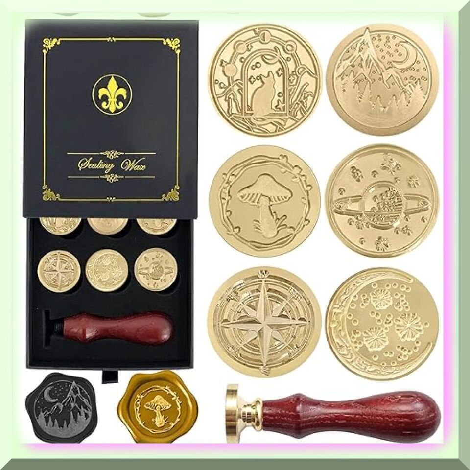 Vast Universe Wax Seal Stamp Gift Box Set - 6 Pcs Copper Seals, 1 Wooden Hilt -