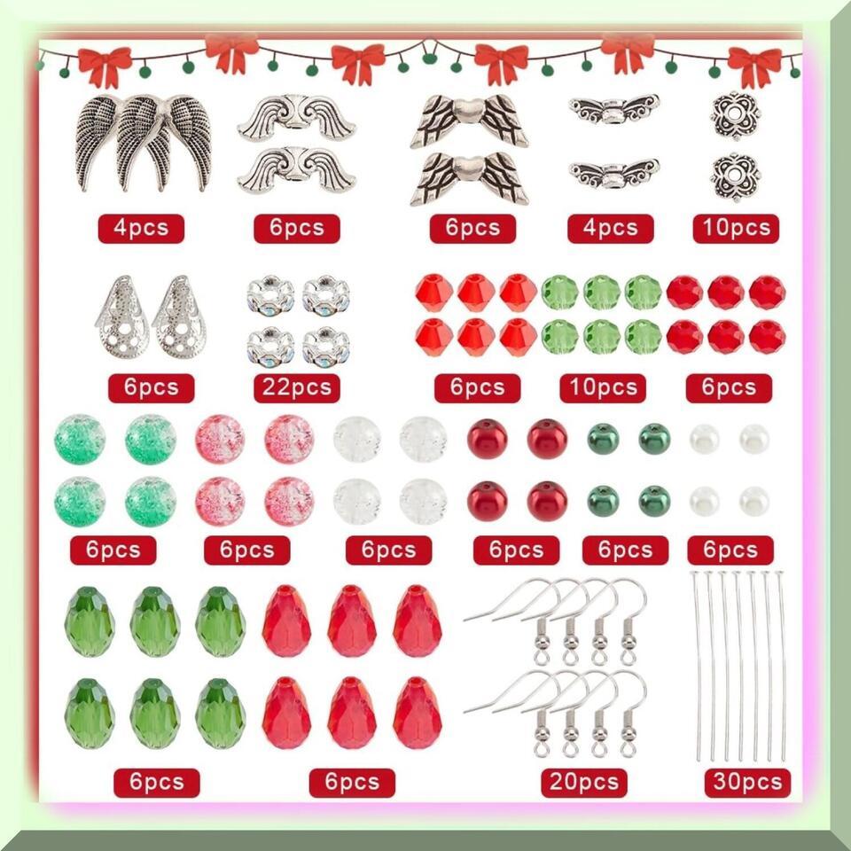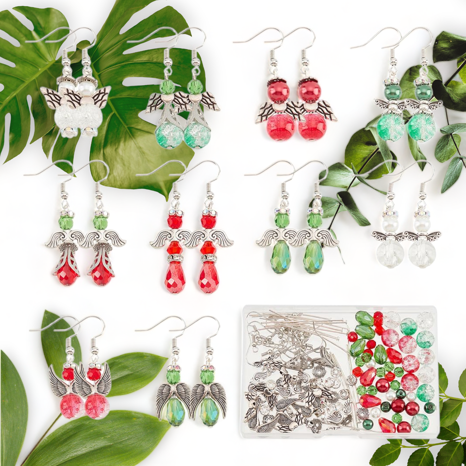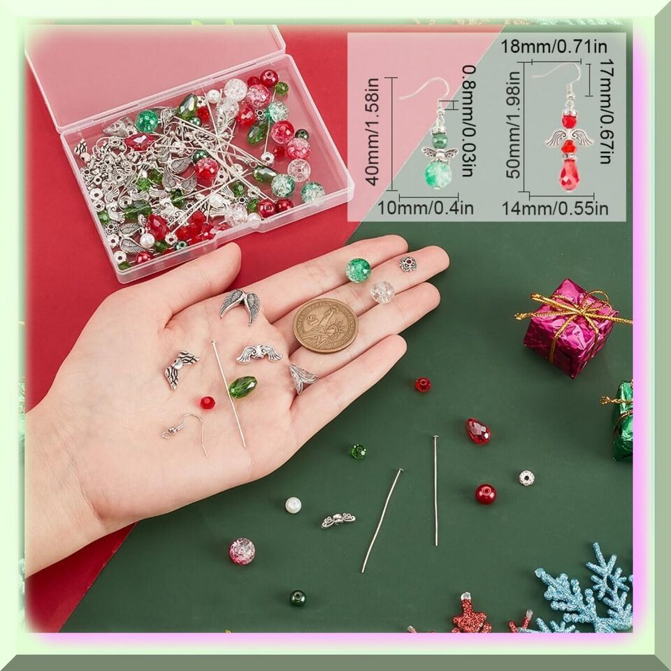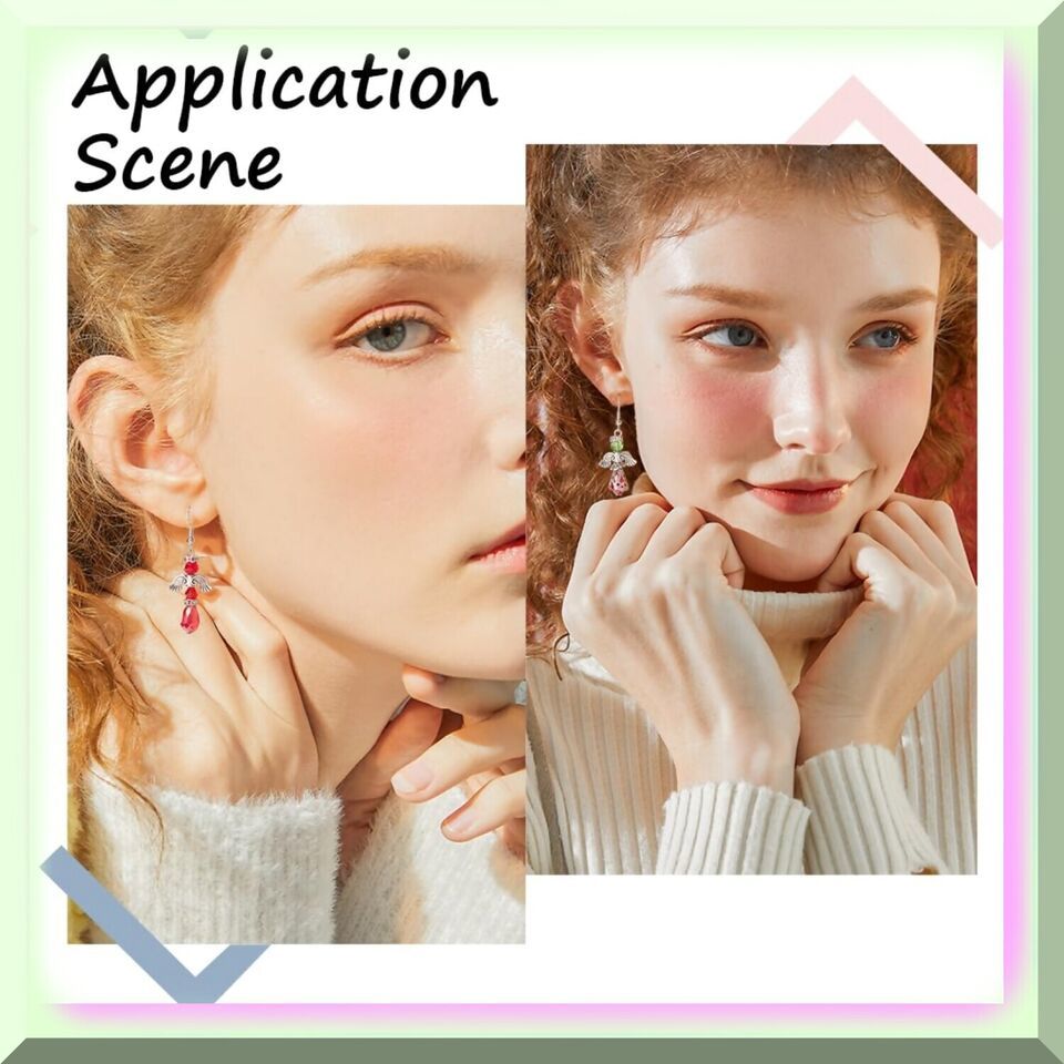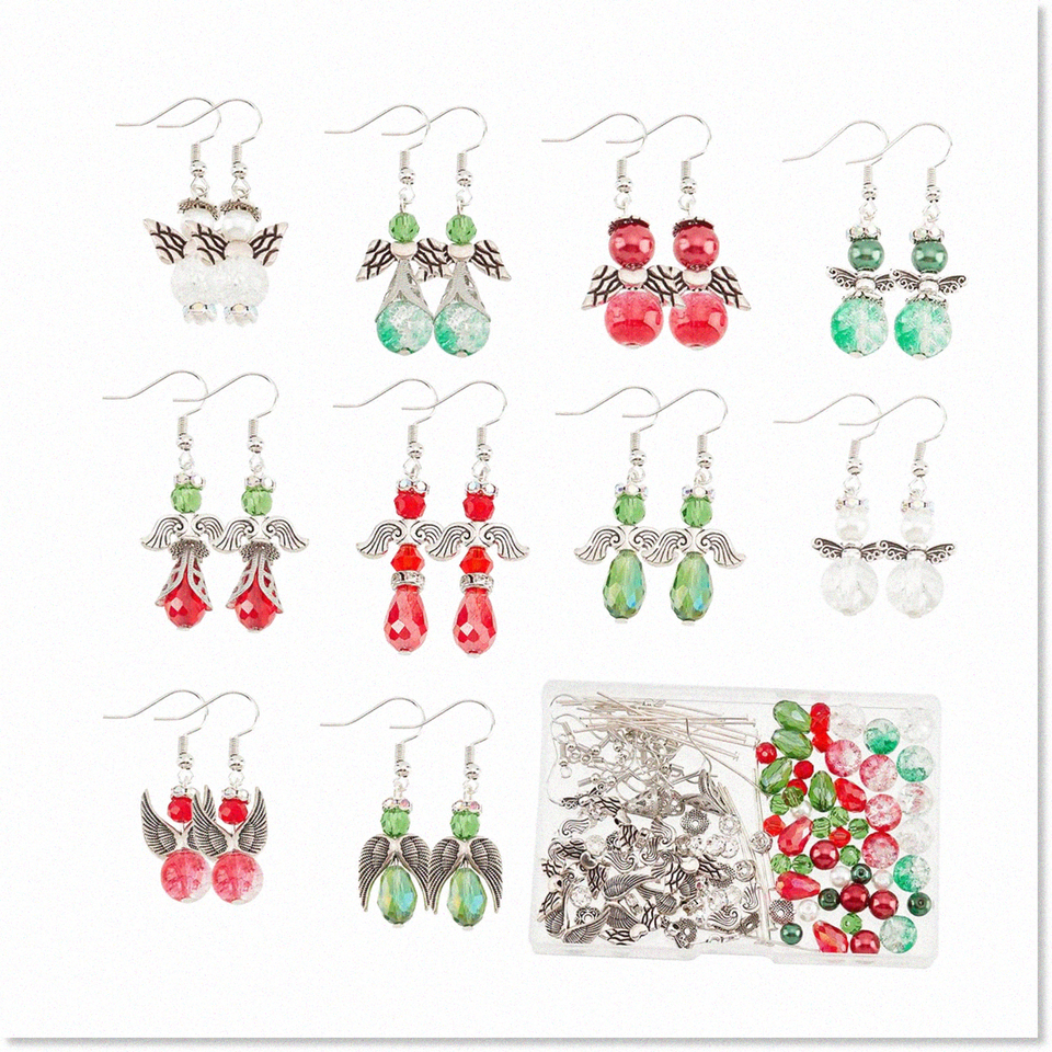 Introducing our DIY 10 Pairs Earrings Set Beading Guardian Angel Charms! These beautiful earrings are not only stylish but also bring luck and protection, as angel charms symbolize just that. Made with premium materials such as gl, alloy, stainless steel, and br, these earrings are durable and long-lasting. The crackle beads, faceted beads, and imitation pearl beads are made of gl, ensuring their beauty won't fade over time. The angel wing beads and flower end caps are made of alloy, adding a touch of elegance to the earrings. The beads cones are made of stainless steel, ensuring their strength and durability. The head pins and earring hooks are made of br, making them safe for sensitive ears. Making these earrings is easy and fun! Simply follow our product pictures and use round beads as the body, bead cones as the dress, and flower end caps as the hats. String the red and green beads and angel wing beads using head pins one by one to make angel charms. Use round pliers with cutting functionality to cut the head pins into suitable lengths, bend the head pins, and connect them to the earring hooks to make guardian angel earrings. Our earring making kit is perfect for DIY beginners, as it contains all the necessary accessories to make 10 pairs of beading angel earrings. You will receive crackle beads, faceted gl beads, opaque beads, angel wing beads, rhinestone spacer beads, flower end caps, bead cones, earring hooks, and head pins. This kit is also a great gift idea! You can make earrings and send them to your loved ones, bringing them luck and protection. After the festival season, you can also string the beads to make daily earrings. Don't miss out on this adorable and meaningful gift!