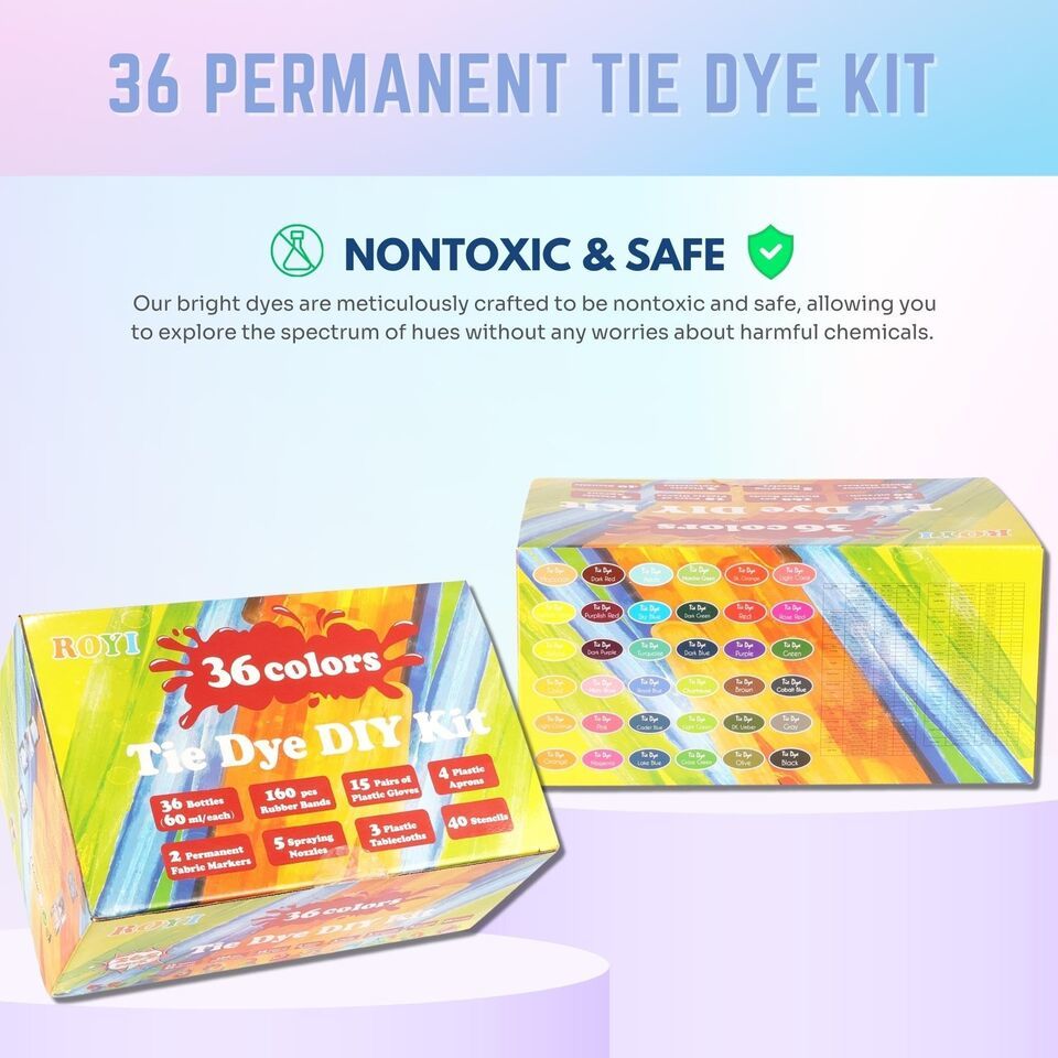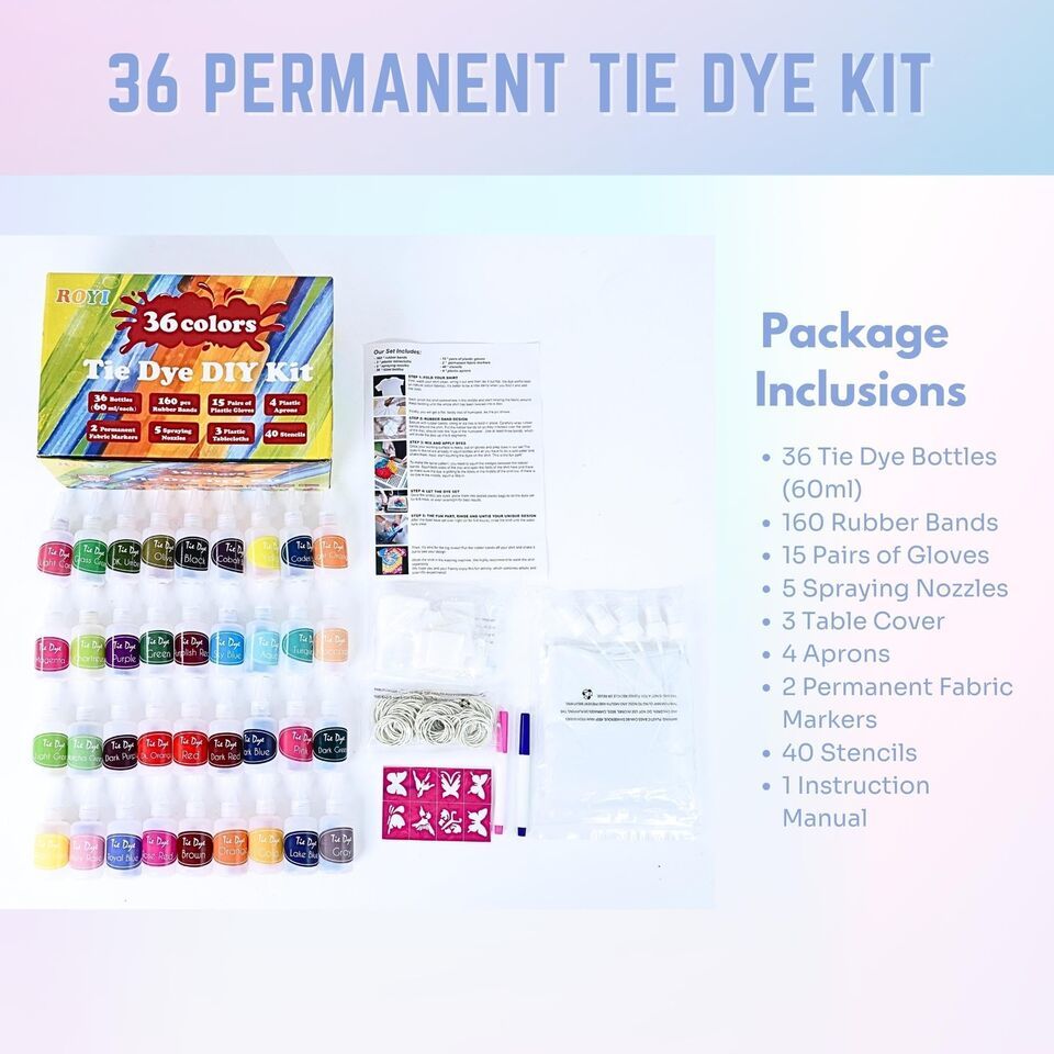 Unleash your inner artist with our captivating DIY Tie Dye Kit for Kids and Adults, designed to ignite your creative spirit and unlock a world of endless possibilities. This family-friendly activity is the perfect way to bond with your loved ones, creating cherished memories that will last a lifetime. Our kits are meticulously crafted to ensure a safe and responsible crafting experience, free from harmful chemicals. Stand out from the crowd with personalized tie-dye designs that reflect your unique individuality. No need to presoak fabrics - simply choose your favorite colors, add water, and shake to activate the vibrant dyes. From t-shirts to tote bags, the options for tie-dye creations are limitless. This kit is also ideal for camps, school events, and birthday parties, adding a burst of color to any group activity. Let your imagination run wild and create personalized gifts that will leave a lasting impression. With 36 tie dye bottles, 160 rubber bands, gloves, spraying nozzles, table covers, aprons, fabric markers, and an instruction manual, this kit has everything you need to get started. For the best color results, we recommend using natural fabrics like cotton, wool, and rayon. To ensure long-lasting colors, avoid soaking your tie-dye creations for extended periods. Get ready to embark on a vibrant and exhilarating tie-dye journey!