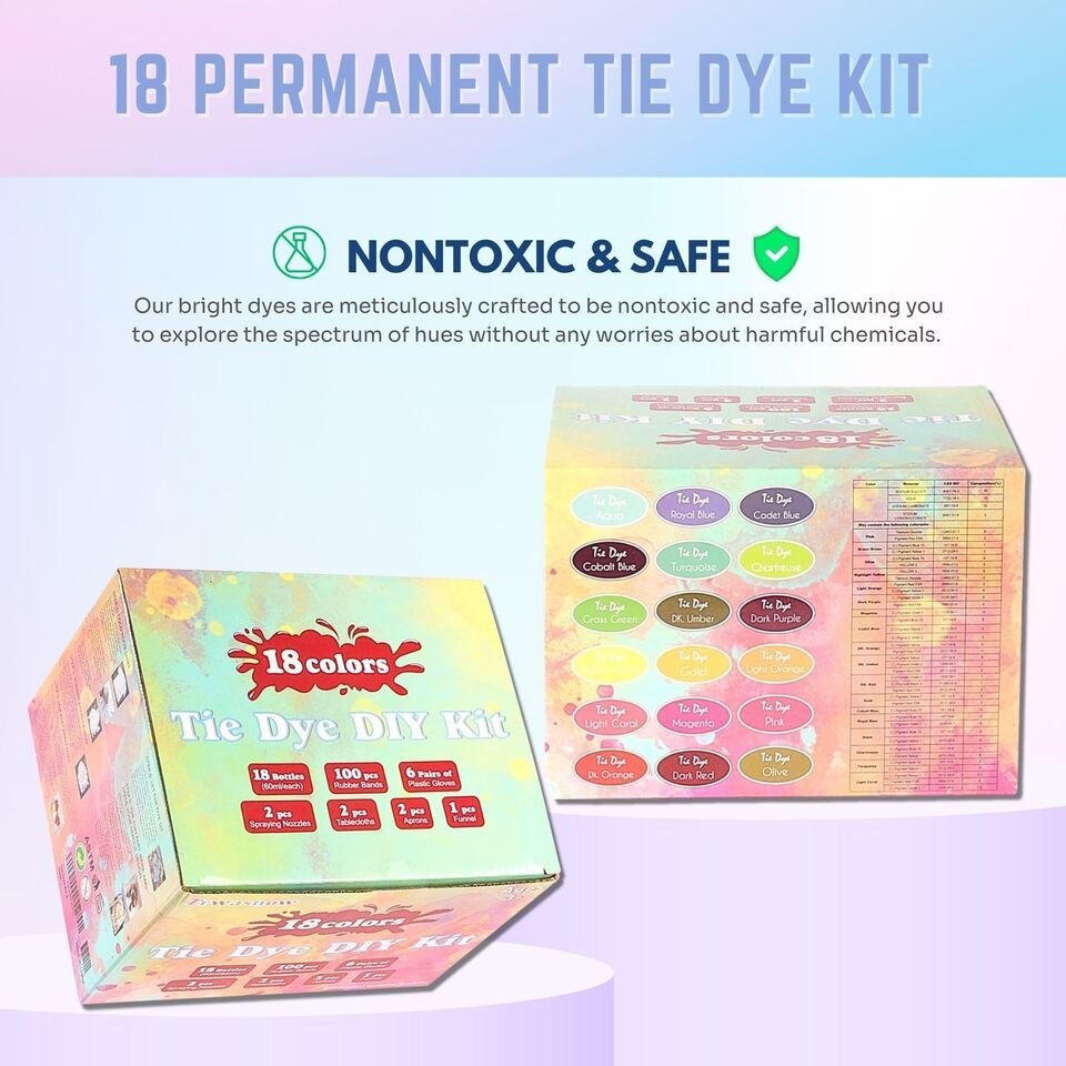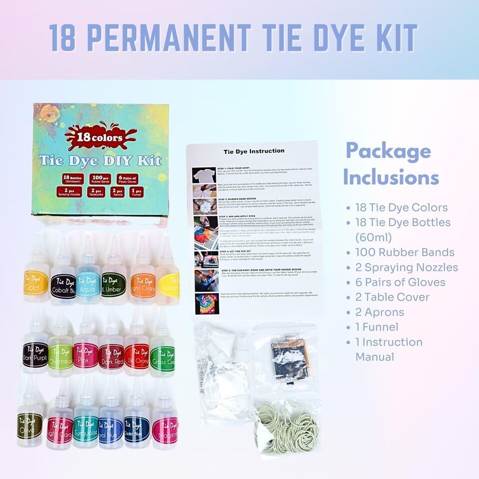 Unleash your inner artist with our captivating DIY Tie Dye Kit for Kids and Adults, designed to ignite your creative spirit and unlock a world of endless possibilities. This family-friendly activity is the perfect way to bond with your loved ones, creating cherished memories that will last a lifetime. Our kits are meticulously crafted to ensure a safe and responsible crafting experience, free from harmful chemicals. Stand out from the crowd with personalized tie-dye designs that reflect your unique individuality. No need to presoak fabrics - simply choose your favorite colors, add water, and shake to activate the vibrant dyes. From t-shirts to tote bags, the options for tie-dye creations are limitless. This kit is also ideal for camps, school events, and birthday parties, adding a burst of color to any group activity. Let your imagination run wild and create personalized gifts that will leave a lasting impression. With 18 tie dye colors, bottles, rubber bands, gloves, and more, this package has everything you need to get started. For the best color results, we recommend using natural fabrics like cotton, wool, and rayon. To ensure long-lasting colors, avoid soaking your tie-dye creations for extended periods. Get ready to embark on a colorful journey of self-expression and artistic exploration with our DIY Tie Dye Kit.