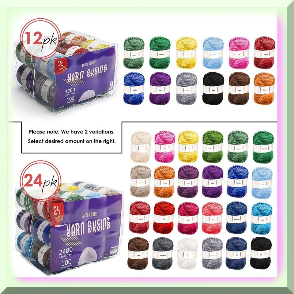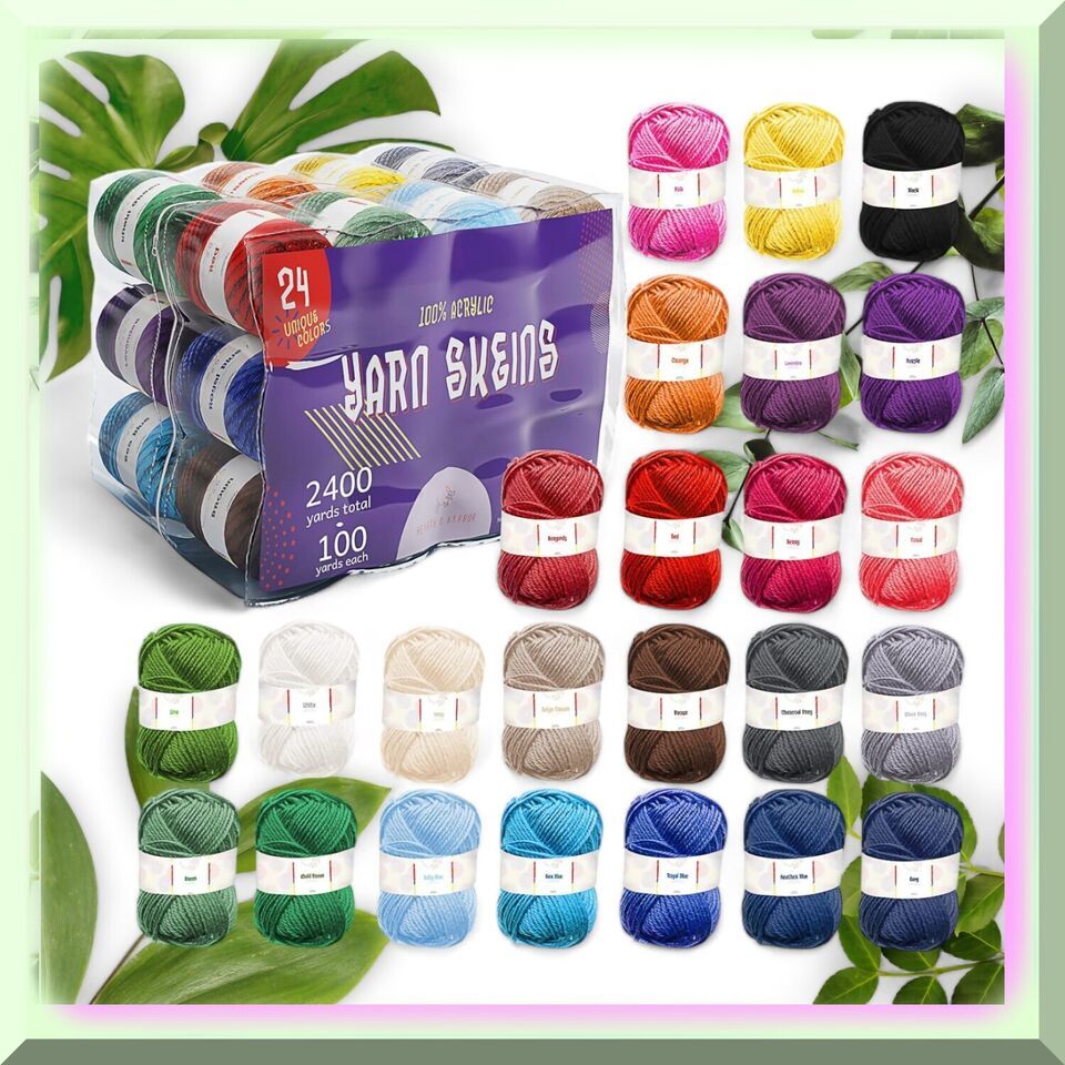 Get your hands on this amazing 24-Pack Acrylic Yarn for Crocheting! This bundle includes a whopping 2400 yards of soft and durable yarn, perfect for all your knitting, crocheting, pom pom making, amigurumi crafting, and more. Each skein boasts 100 yards of worsted 4-ply yarn, compatible with 3mm and 3.5mm crochet hooks. With its vibrant colors, this yarn set is an absolute dream for beginners and seasoned crafters alike. Let your imagination run wild and create stunning designs with these 24 vivid shades. Not only is this multipack ideal for personal projects, but it also works wonders for clroom activities. It's a fantastic tool for developing fine motor skills, cutting skills, and color recognition. And that's not all! Incorporate this yarn into your STEAM projects and watch your creativity and critical thinking skills soar. Whether it's for artwork, engineering supplies, or science demonstrations, this yarn is a must-have for any aspiring innovator. ==== FEATURES: ===== 1. Aesthetic Assortment: This 24-pack acrylic yarn for crocheting boasts a captivating collection of colors, carefully curated to ignite your creative spark. With a spectrum of shades ranging from vibrant jewel tones to soothing pastels, this assortment is a feast for the eyes and a playground for your imagination.