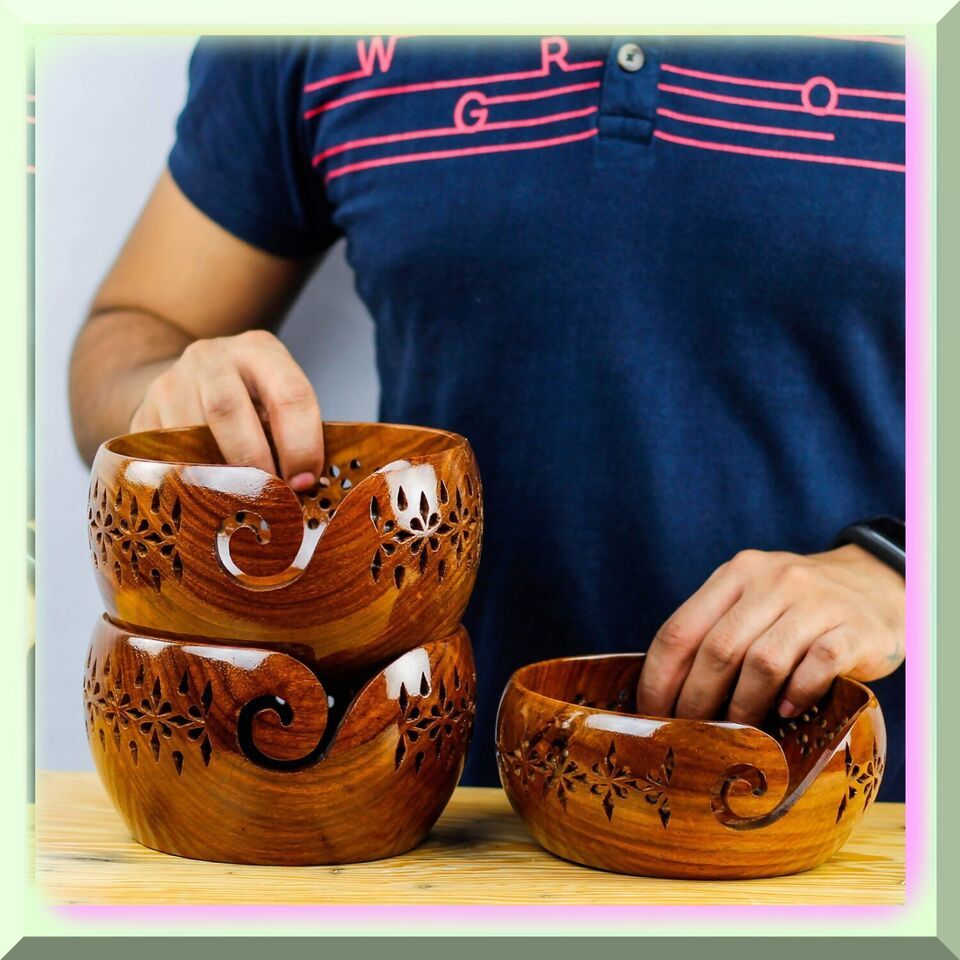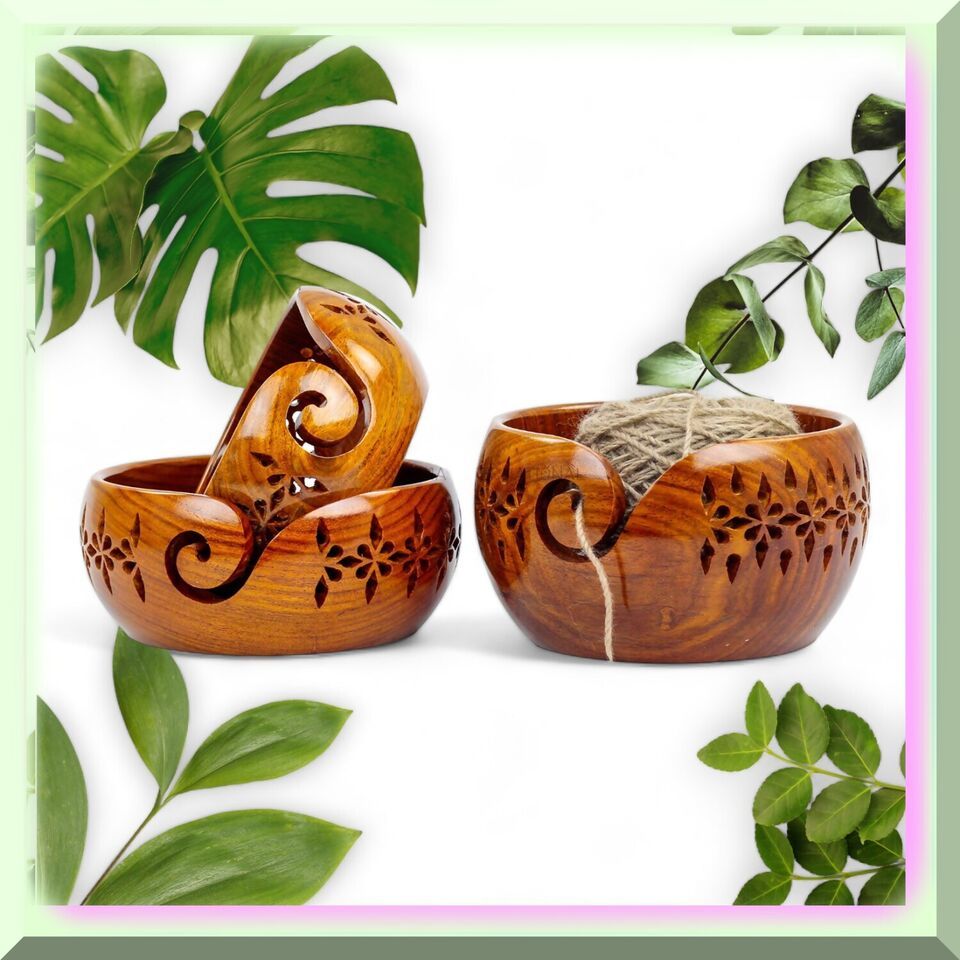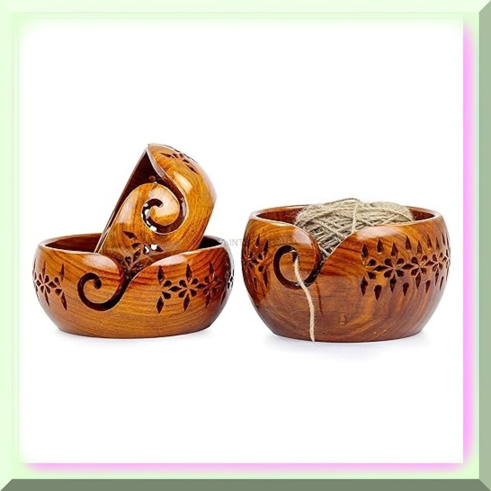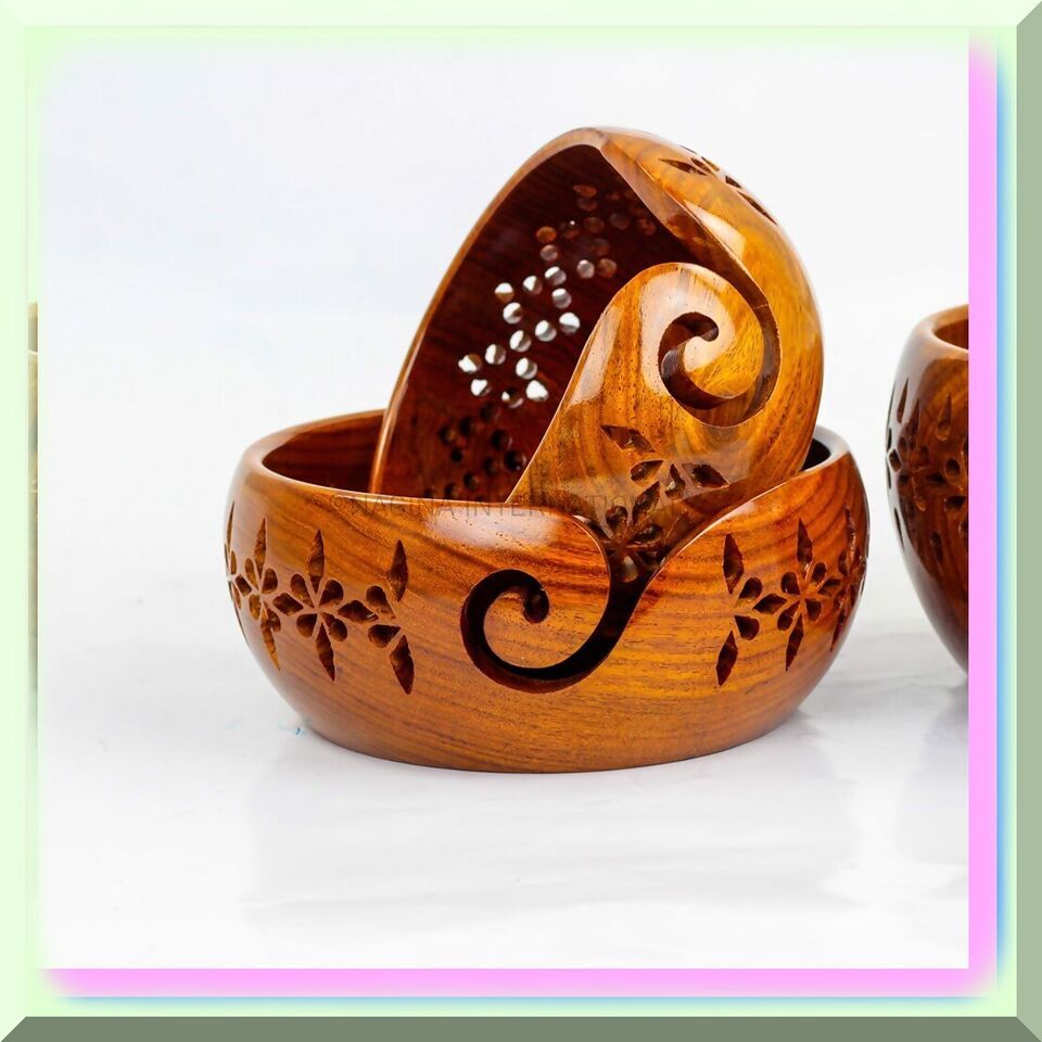 Rosewood Yarn Haven: Exquisite Wooden Bowl with Carved Holes - Complete Knitting