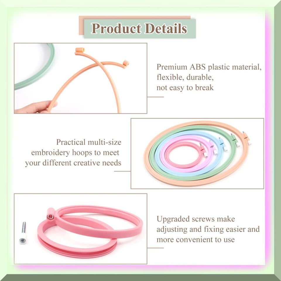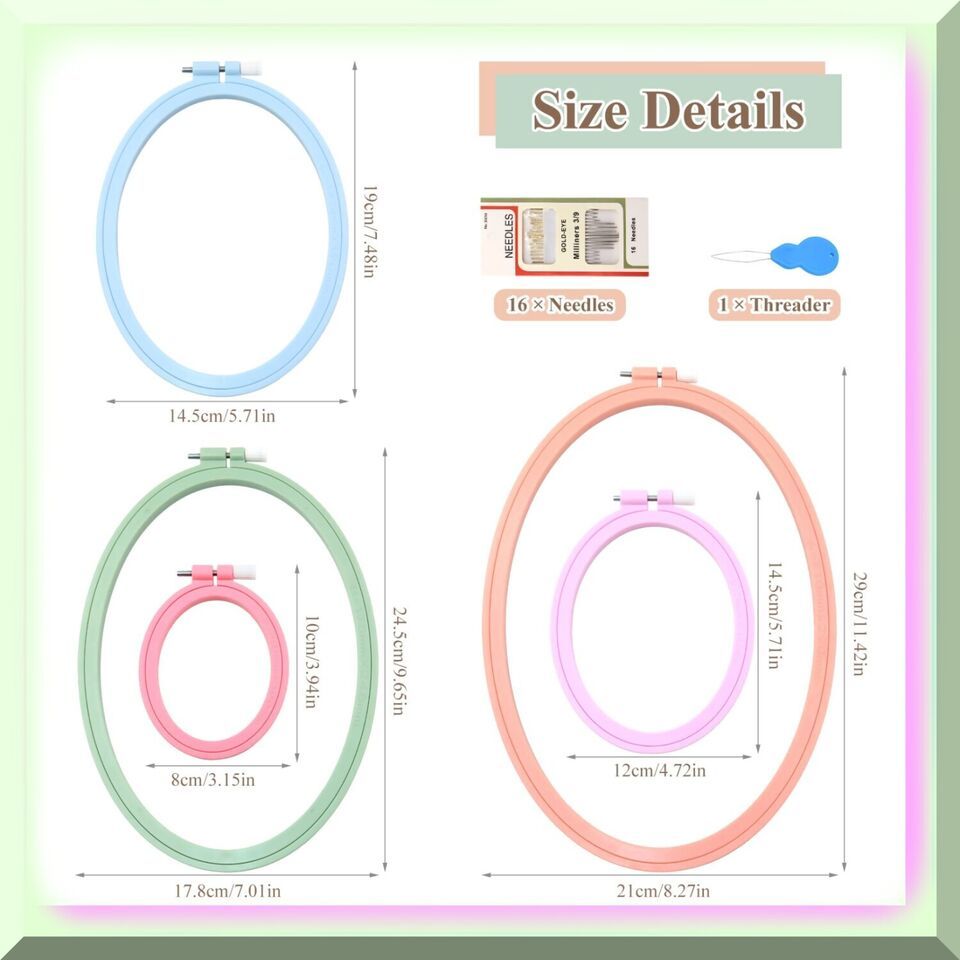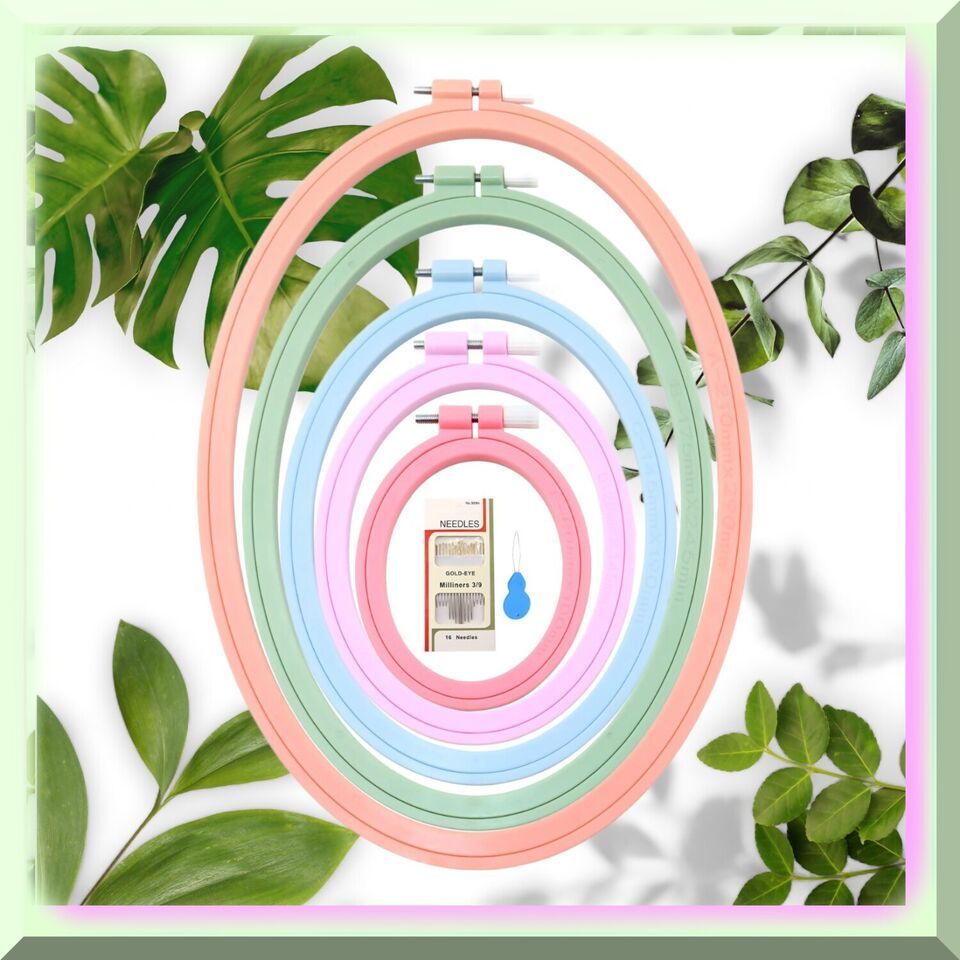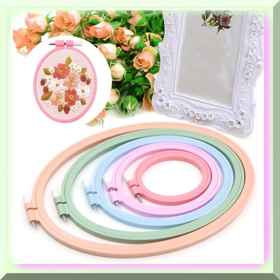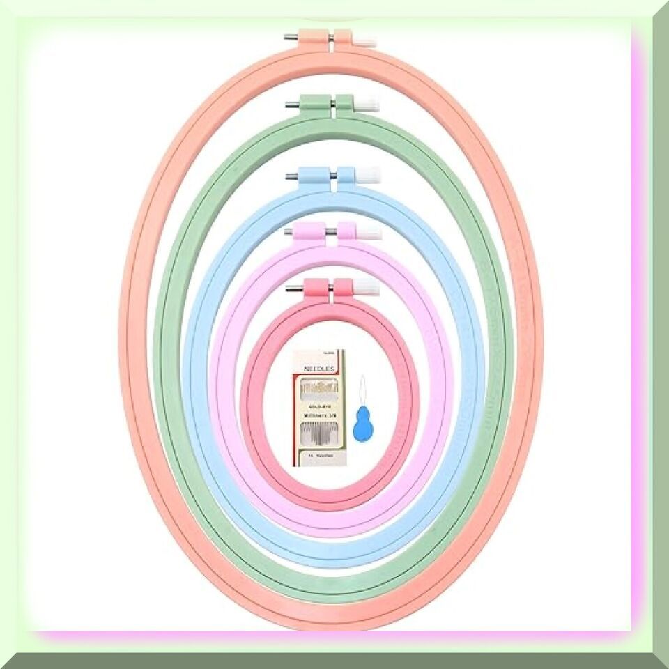Discover the exquisite Oval Embroidery Hoops, crafted with durable ABS plastic. These Cross Stitch Hoops are the perfect companions for your sewing, needlework, and embroidery projects. Elevate your creativity with these versatile and sturdy Embroidery Frames. ====== FEATURES: ======== [A]mple Variety: Our embroidery hoop set comes with 5 PCS, providing you with a generous assortment of oblong hoops. Whether your embroidery projects are small or large, we have got you covered with a great size variety.