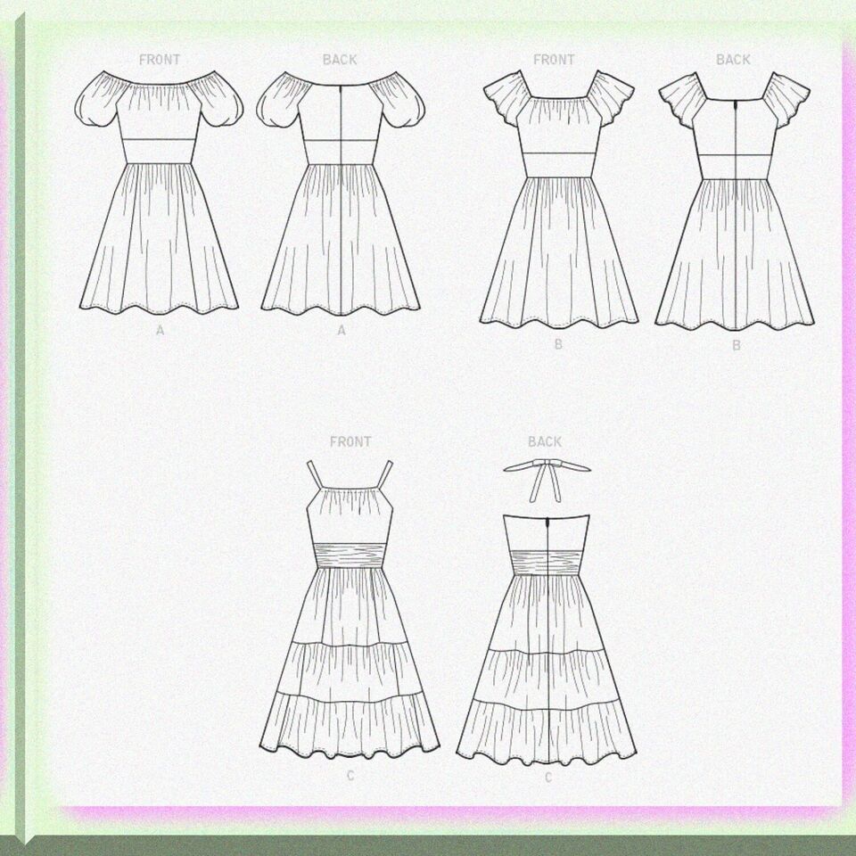 (A) **Versatile Dress Templates with Style Variations**: Unleash your creativity with our comprehensive sewing templates that cater to a variety of dress styles. Whether you're aiming for a chic fit-and-flare dress with elasticized necklines, puff and ruffle sleeves, or a sophisticated halter dress with a tiered skirt, this packet has you covered. Each template is meticulously designed to help you stay ahead of today's fashion trends, ensuring your wardrobe is always on point.
