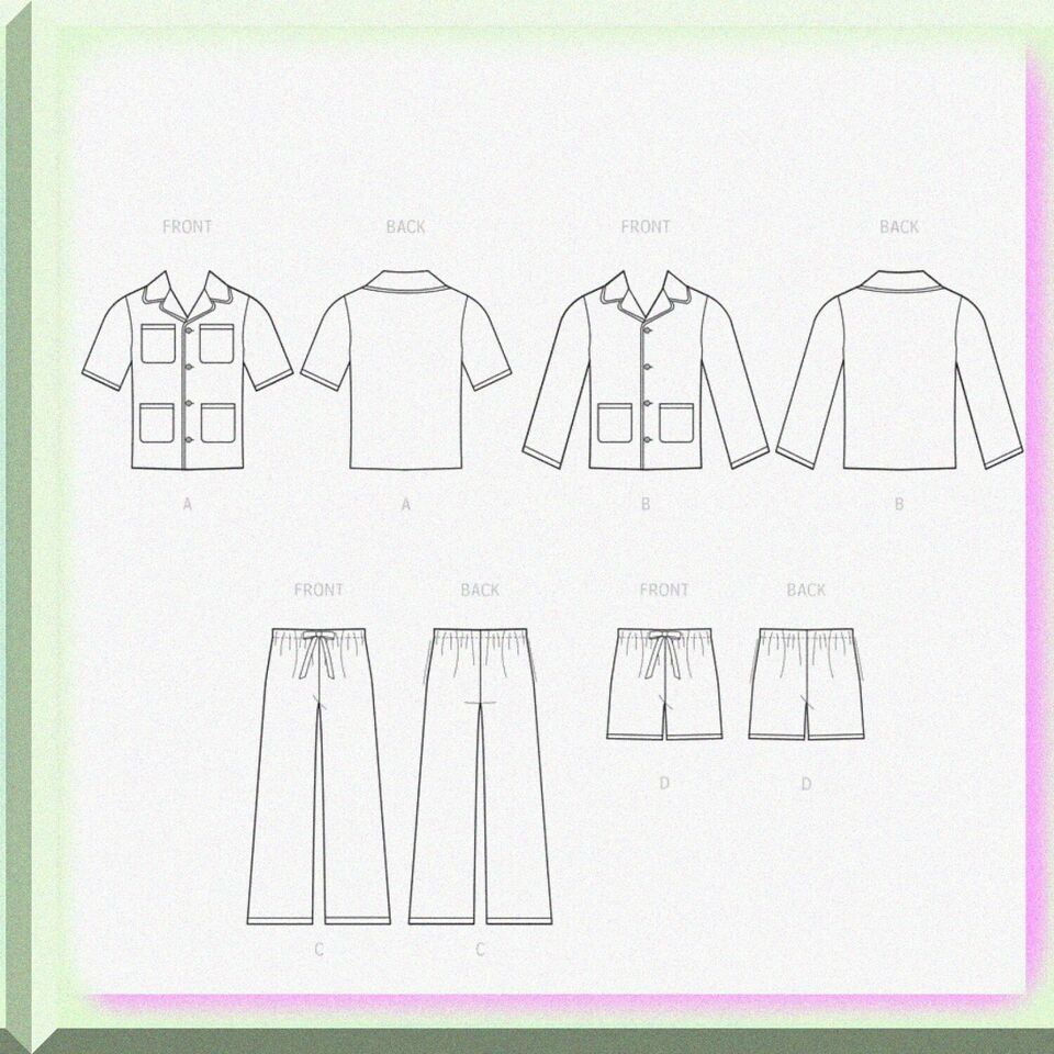 (A) **Versatile Pajama Set Templates**: Dive into a world of creativity with our comprehensive sewing pattern packet that includes templates for a complete pajama set. Craft two stylish tops, a pair of cozy pants, and a pair of breezy shorts. Whether you're lounging at home or catching some Z's, this set has you covered with options for both short and long sleeves, all featuring chic collars with piping and practical patch pockets.