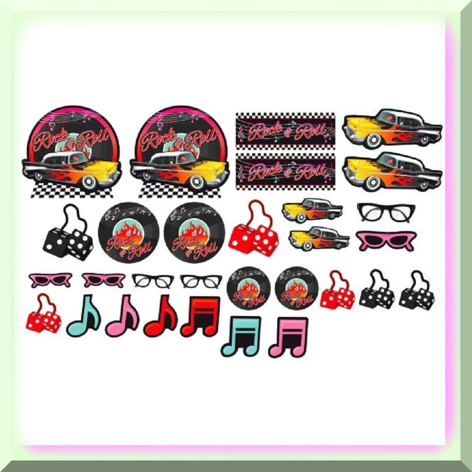 1. Cutout Kit: This incredible cutout kit is a must-have for any party enthusiast! With a total of 16 cutouts, including 5" hopped-up Thunderbirds, 8" vinyl records, and 11" fuzzy dice, this kit is sure to add a touch of retro charm to your event. Made from durable laminated cardstock, these cutouts are built to last and can be easily displayed on walls, doors, or tables. Whether you're hosting a 50s-themed party or simply want to bring a blast from the past to your gathering, this cutout kit is the perfect choice.