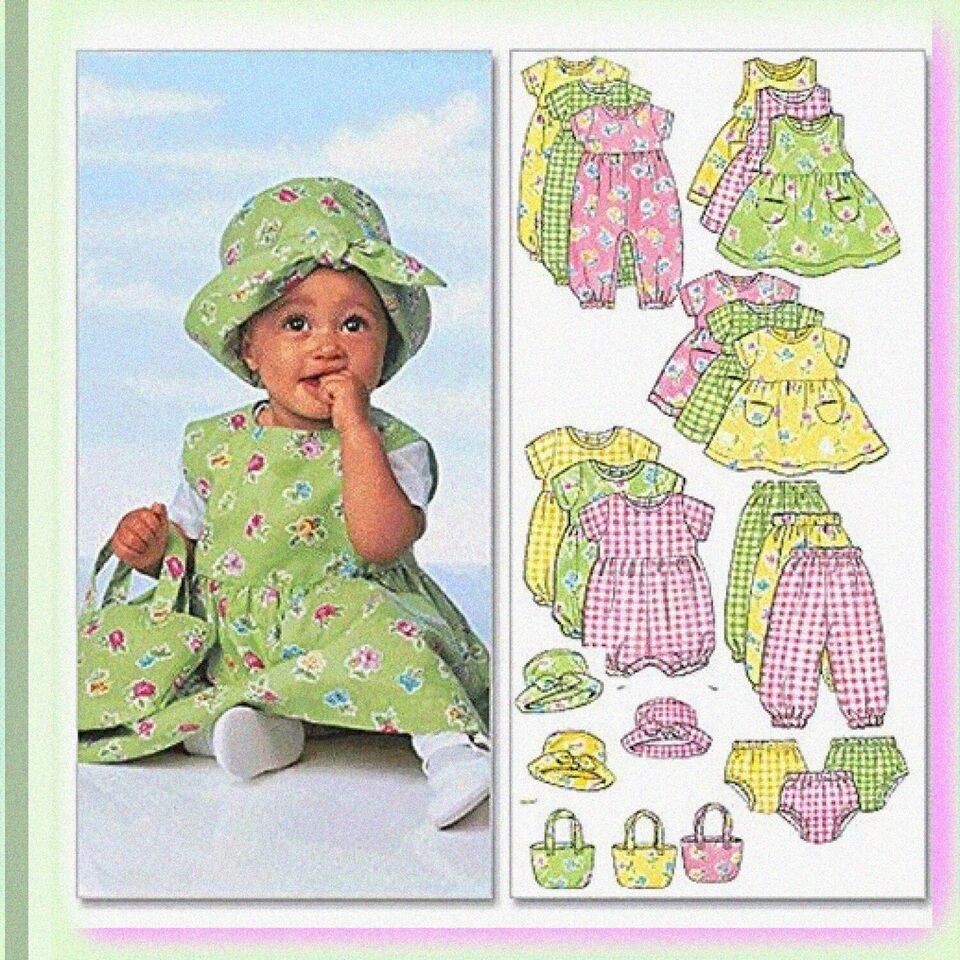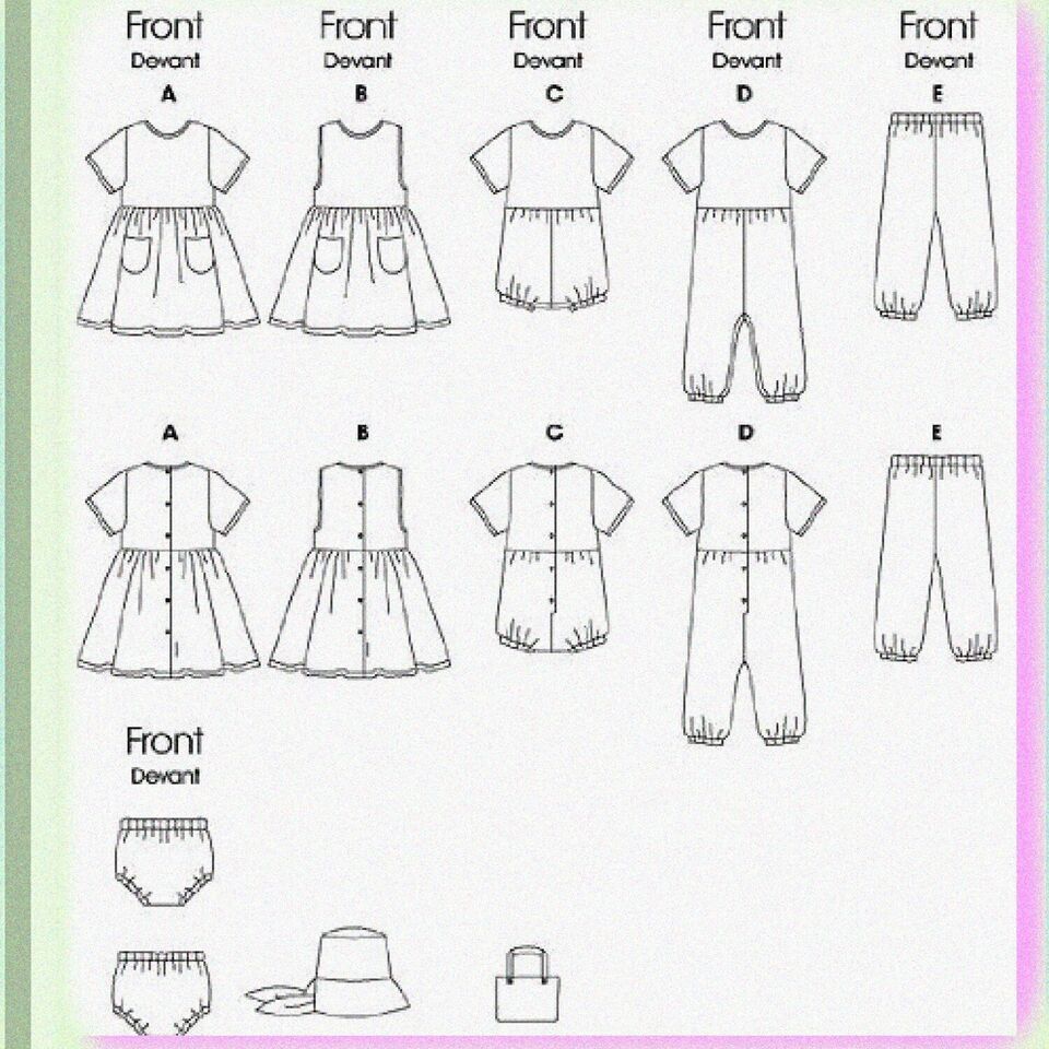 Introducing our adorable Infants' Ensemble! This multi-piece set includes a charming dress, jumper, romper, jumpsuit, panties, pants, hat, and bag, all designed for a perfect custom fit. Each piece features a fitted bodice, raised waist, and back button closure. Choose from drindl skirts with pockets or loose-fitting shorts with snap crotch. The elastic waist pants and panties ensure comfort, while the self-lined hat and bag add a stylish touch. Crafted from lightweight fabrics like broadcloth and seersucker, this set is perfect for your little one's wardrobe. Ideal for newborns to XL sizes. Get ready to dress your baby in cuteness and comfort! ==== FEATURES: ==== Sure, here are three catchy and clear product features for the given input: