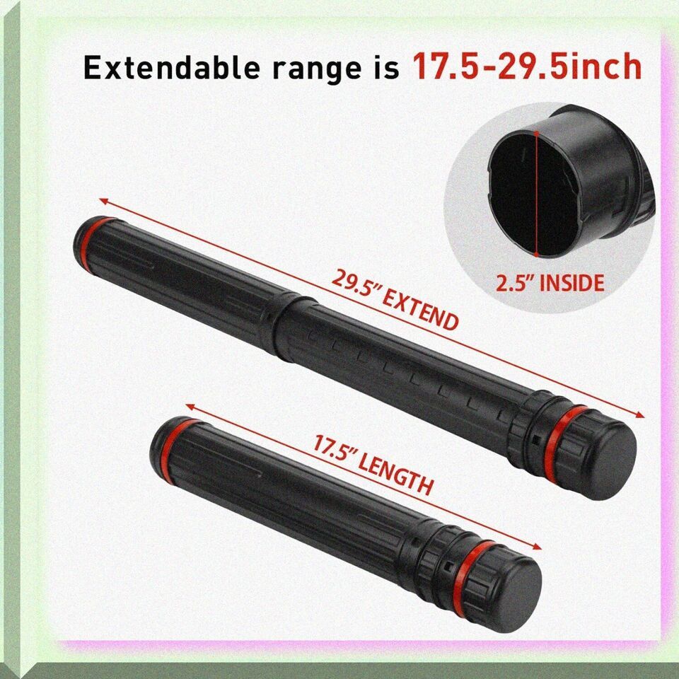 Introducing the Ultimate Storage Tube - your go-to solution for endless possibilities! Perfect for storing and traveling with posters, blueprints, maps, documents, large photo prints, drawings, artwork, arrows, fishing rods, drumsticks, and more. Crafted from durable plastic, this versatile tube keeps your treasures safe and secure. Unleash your creativity and keep your essentials protected with the Ultimate Storage Tube - where imagination meets functionality! ==== FEATURES: ==== (A) **Adjustable Length**: Our Document Tube is designed with versatility in mind, effortlessly extending to accommodate documents ranging from 17 inches to a whopping 34 inches. Whether you're storing blueprints, posters, or artwork, this tube adapts to your needs, ensuring your valuable papers are always protected and perfectly snug.