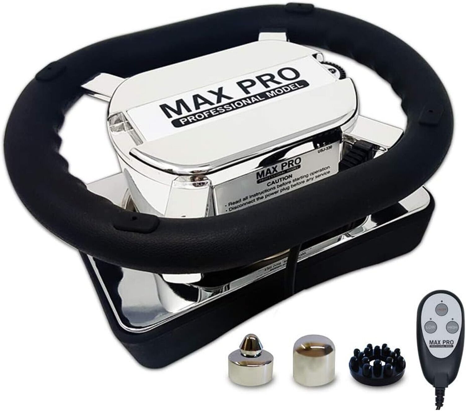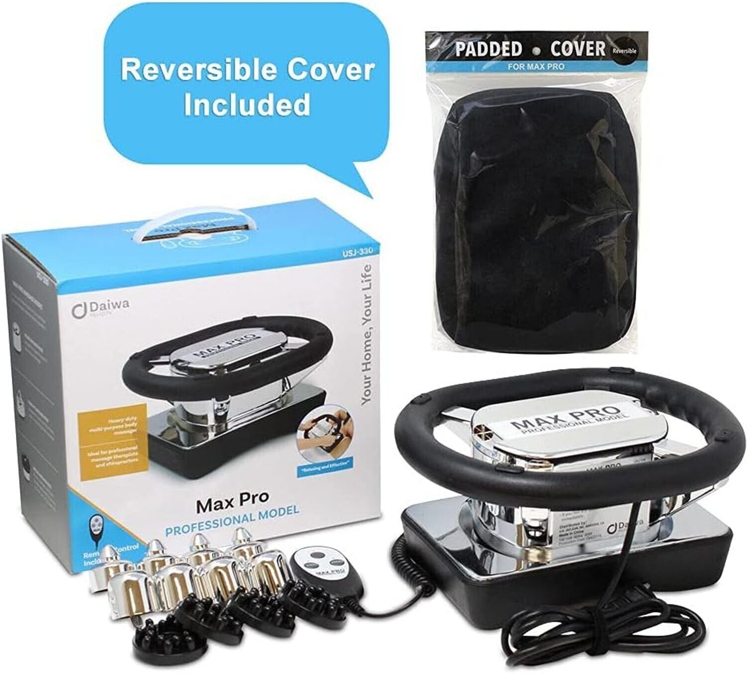 Daiwa Felicity USJ-330 Max Pro Chiropractic Massager Professional Heavy Duty Rub Variable Speed Massager; Variable Speed Massager, Features a Large, Curved Pad Designed to Fit the Shape of Your Body; Chrome Construction Will Hold Up After Years of Regular Use and is Easy to Clean; For a Reflexology Foot Massager, Turn the Unit Over and Attach Massage Heads