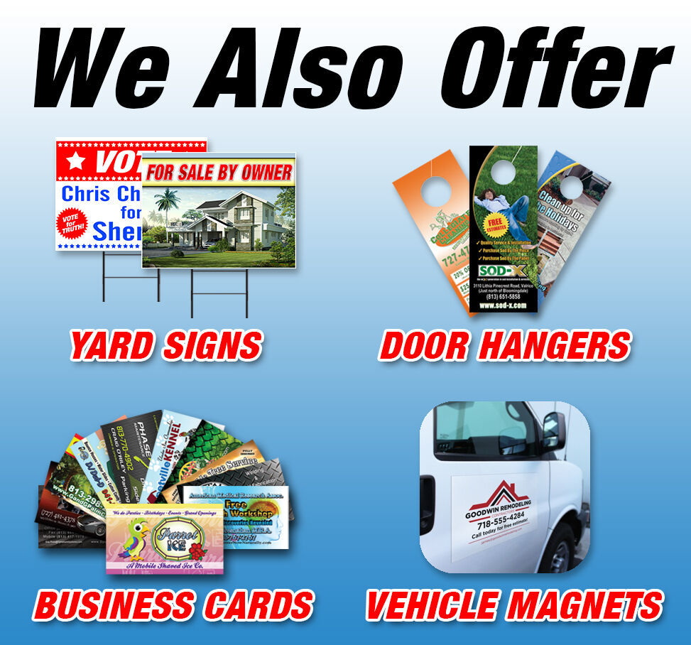 Tampa Printing uses heavy duty premium 13 oz indoor / outdoor vinyl banner material. All banners are printed using industry best latex ink technology, are UV and water resistant, and withstand hot and cold conditions. All banners include metal grommets in each corner for easy hanging. Larger banners receive additional grommets and reinforced hemming along all sides. All banner dimensions are Height (top to bottom in inches) and Width (left to right in inches).