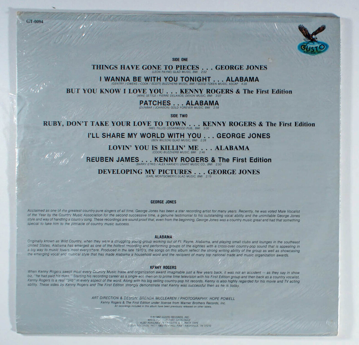 George Jones, Kenny Rogers, Alabama is a collection of some of the best sounds in country music during the 1960s and 70s. I Wanna Be with You Tonight, by Alabama was the band's first charting single. All three selections by Kenny Rogers and The First Edition were Top 40 Pop hits for the band in 1968 and 69. I'll Share My World With You nearly took George Jones to the top of the Country charts, stalling at No. 2. And Things Have Gone to Pieces was another Top 10 notch in Jones' belt in 1965.